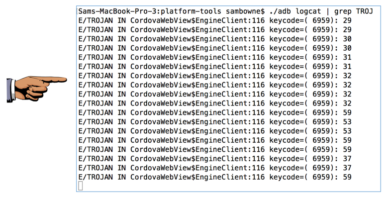 The log should show a series of numbers similar to that shown below. These numbers are key codes, spelling out the characters you typed in.