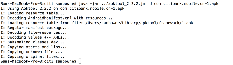 Move the APK file to some convenient directory to work in, such as Downloads. I worked in a subdirectory named "citi".