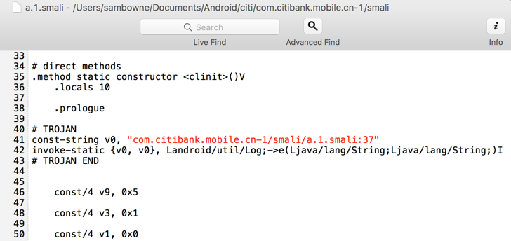 troj2 = '"\ninvoke-static {v0, v0}, Landroid/util/Log;->e(Ljava/lang/String;Ljava/lang/String;)I\n# TROJAN END\n\n'