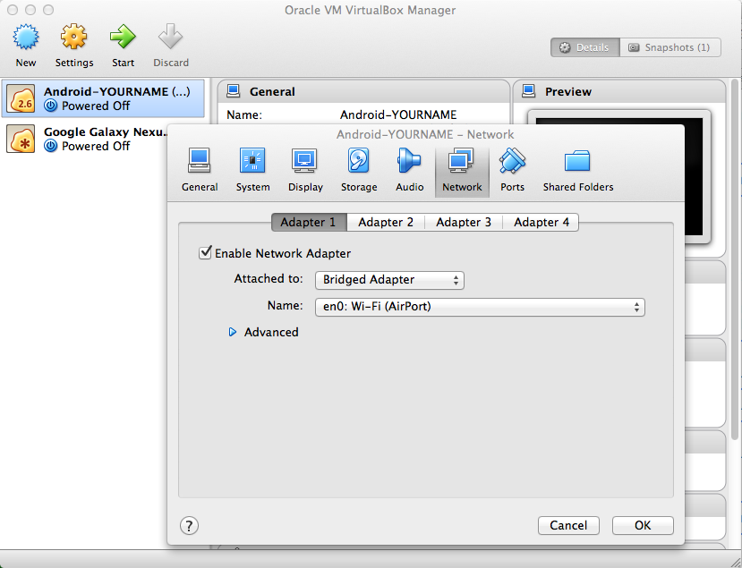 In the list of virtual devices, click the "Android-YOURNAME" device.