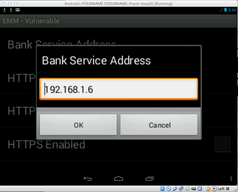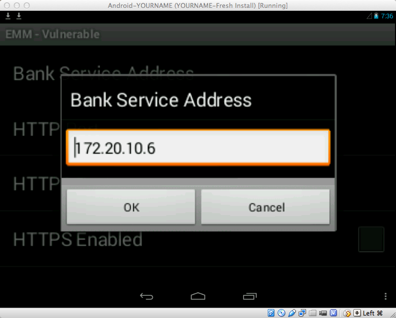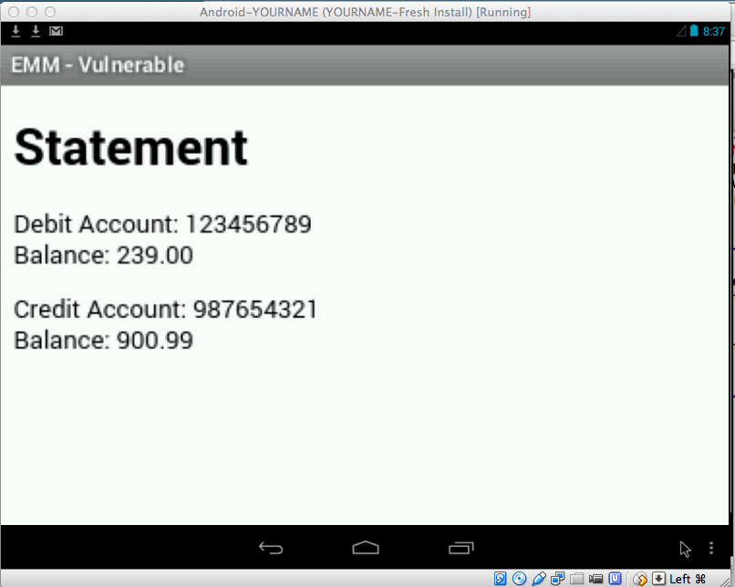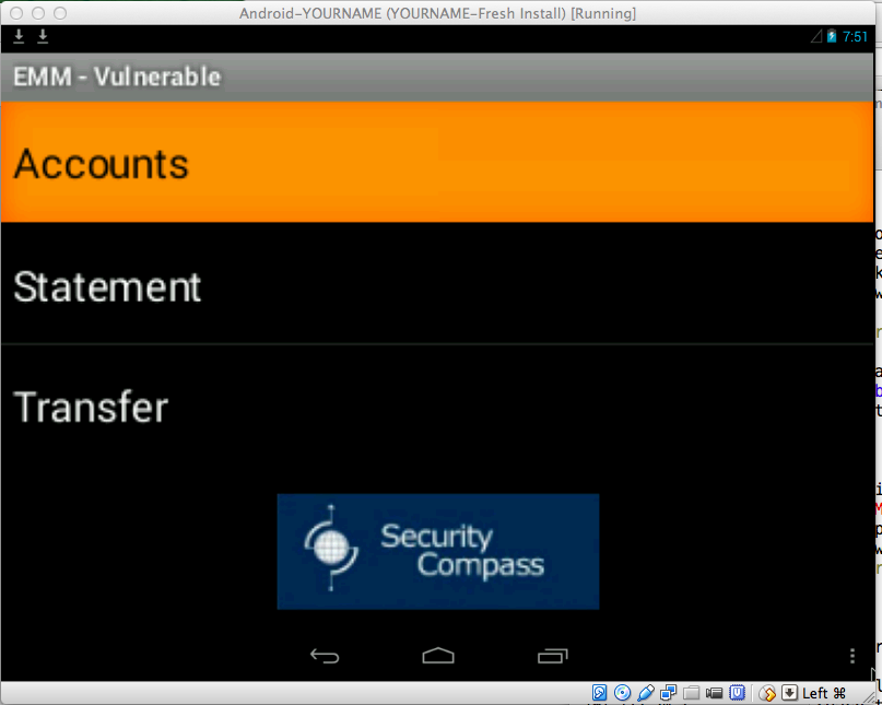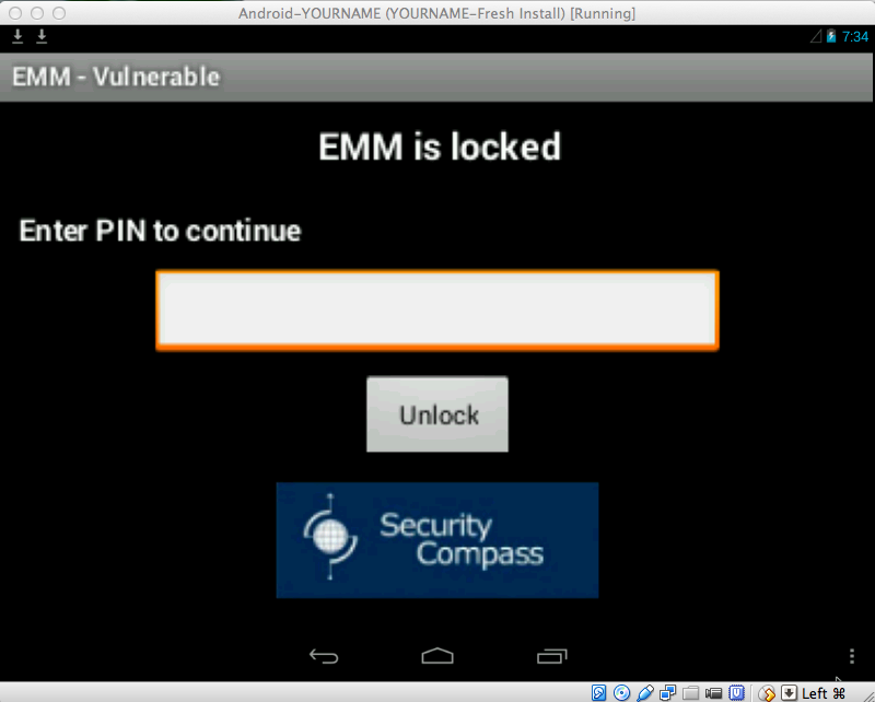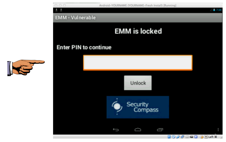 The "EMM - Vulnerable" app appears in the emulator, as shown below.