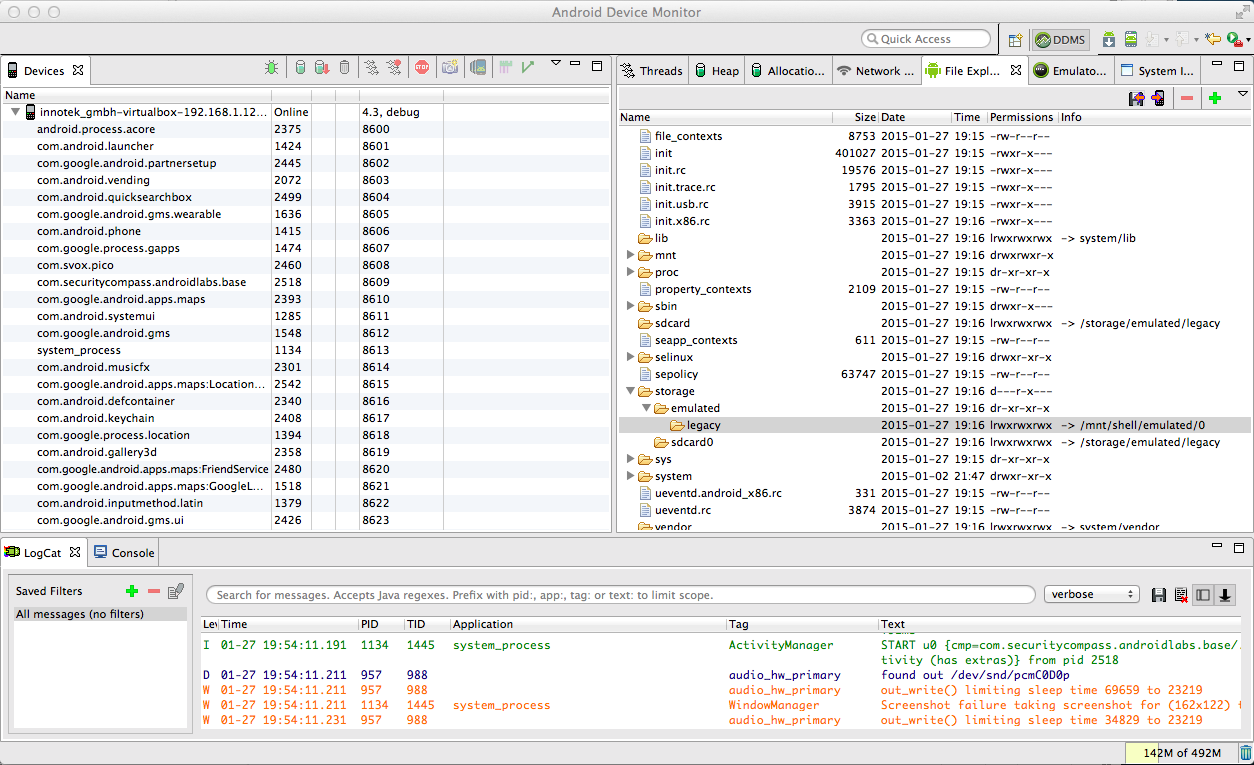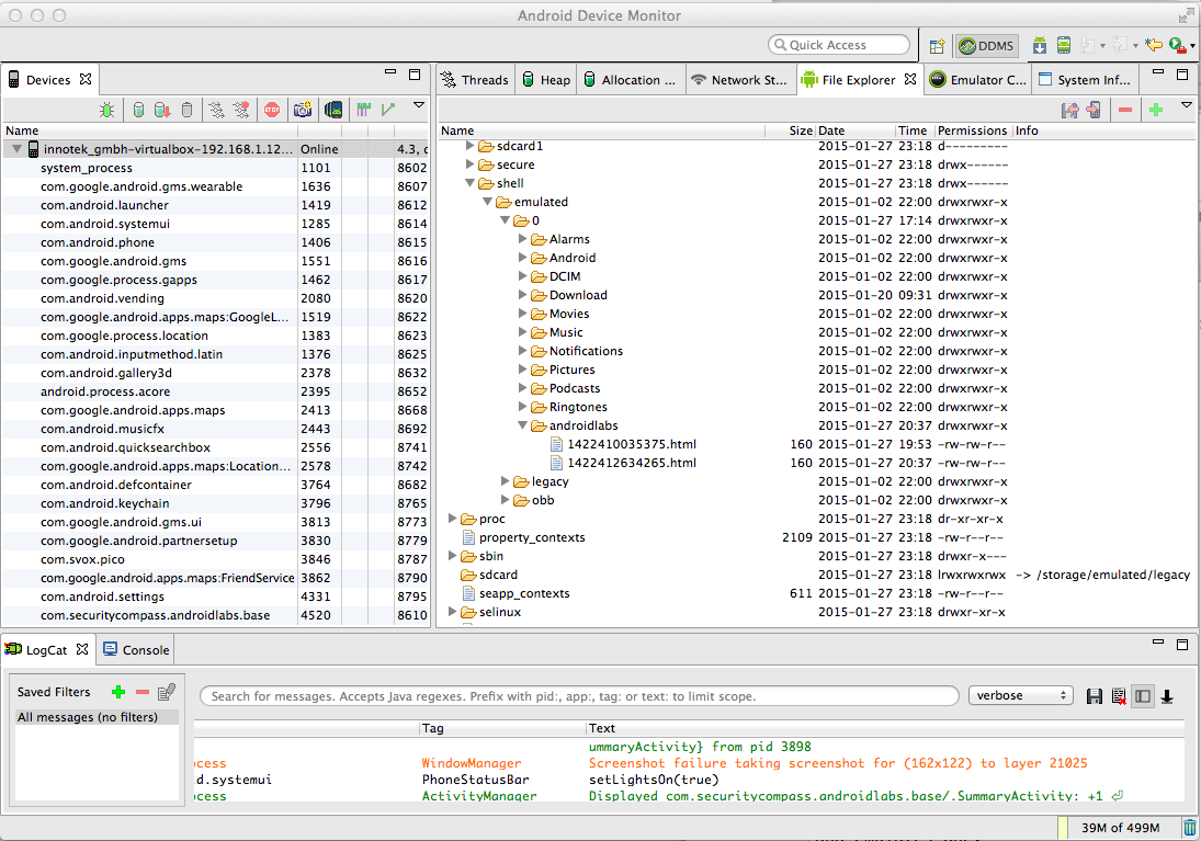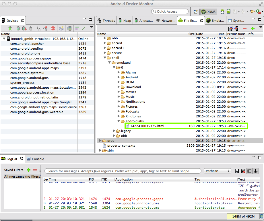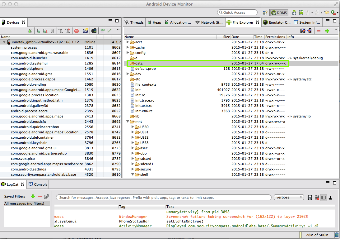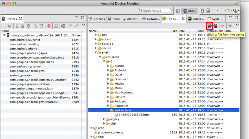 The "Android Device Monitor" opens, showing the file system of the Android device in the top right pane as shown below.