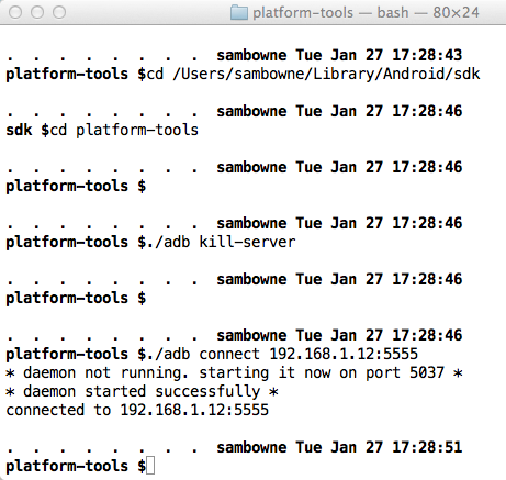 You should see the message "connected to..", as shown below.cd /Users/sambowne/Library/Android/sdk