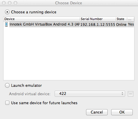 Verify that the "..VirtualBox Android..." device is selected, as shown above, and click OK.