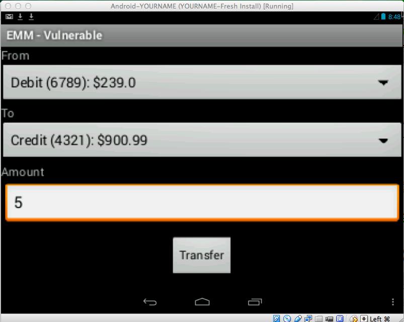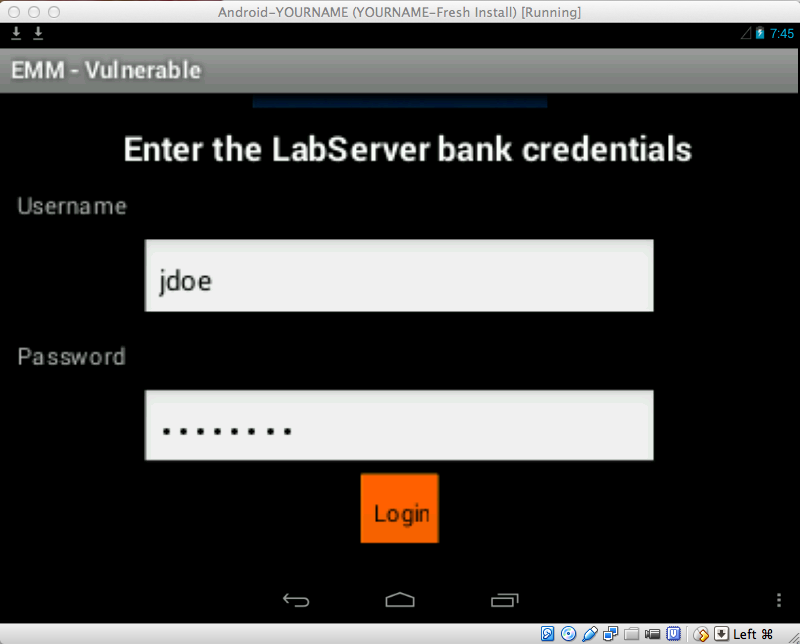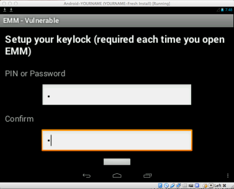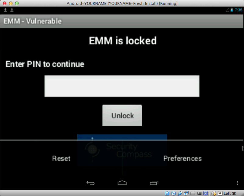 The "EMM - Vulnerable" app appears in the emulator, as shown below.