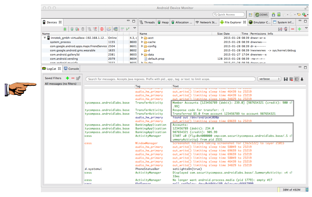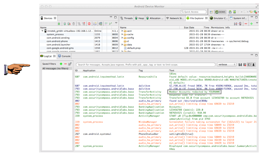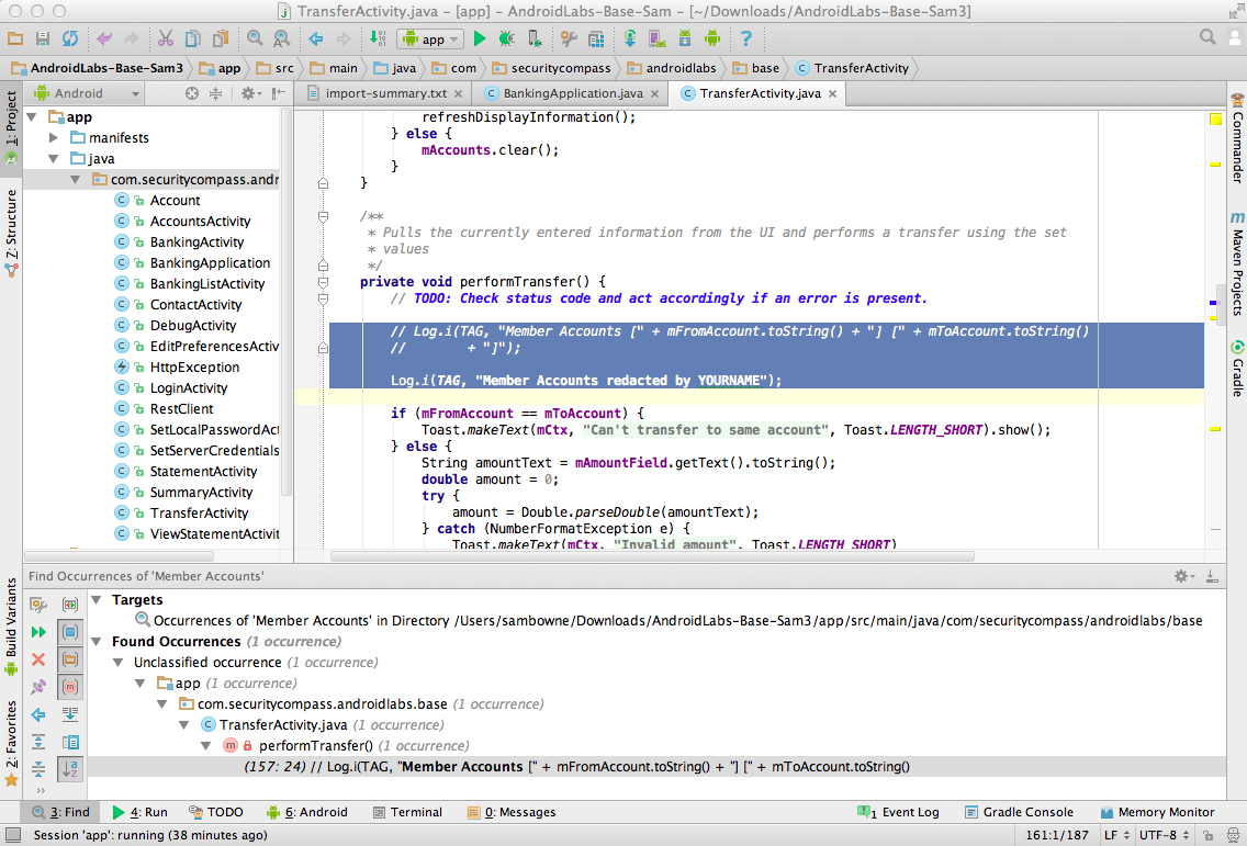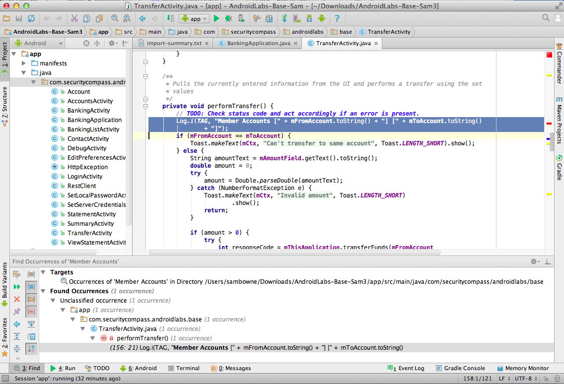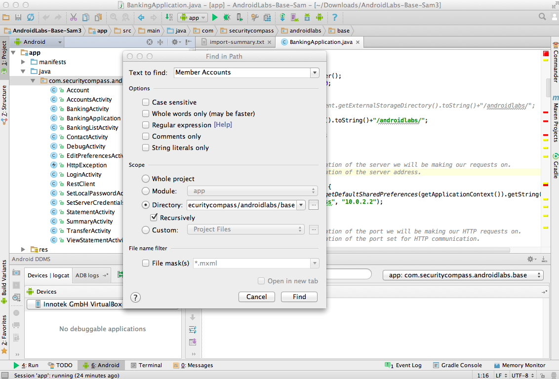 In Android Studio, in the top left pane, click .com.securitycompass.androidlabs.base to highlight it, as shown below.