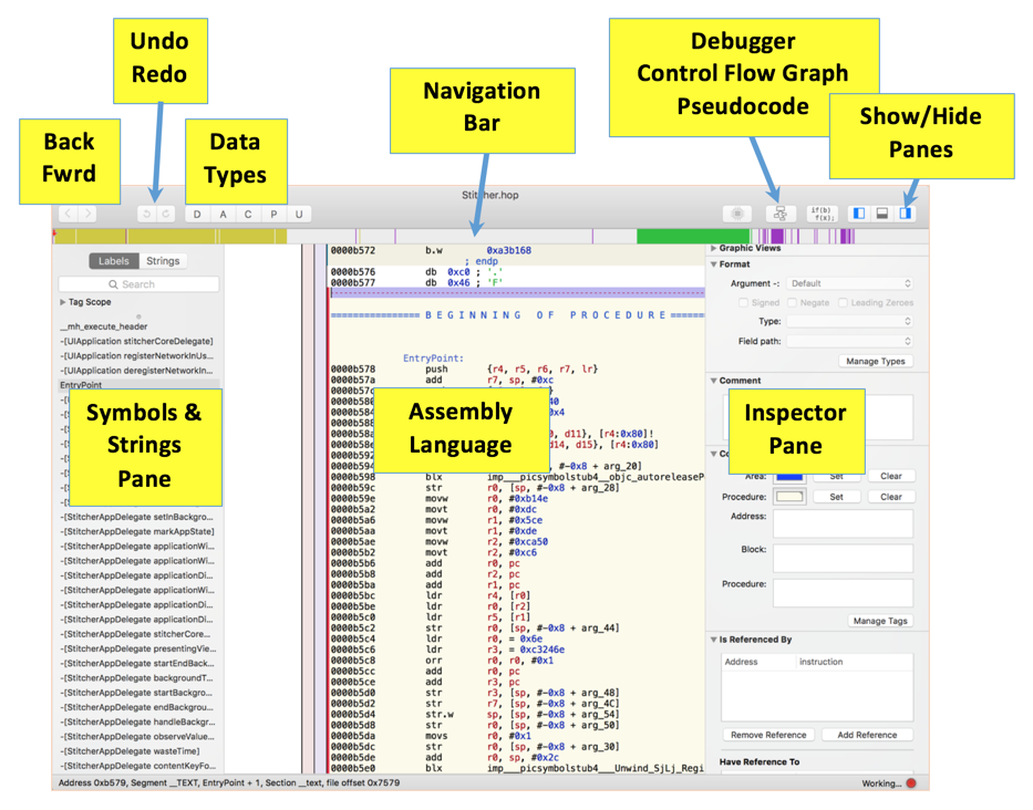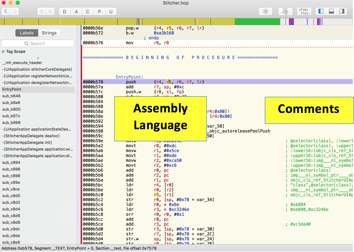 In its right pane, Hopper now shows assembly language instructions like "push" and "add" on the left, and helpful comments in green on the right, as shown below.