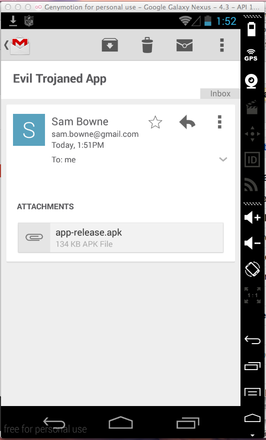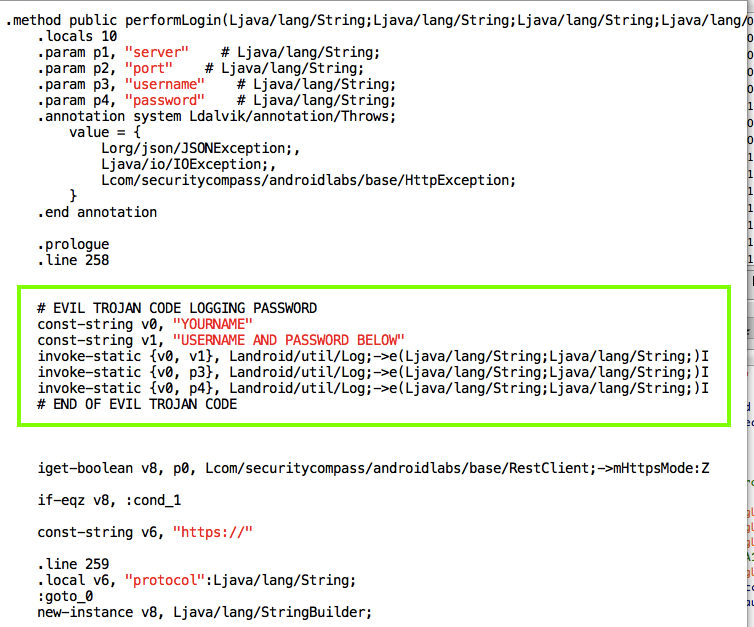 This is a nasty thing to do. Only distribute your trojaned apps in controlled test environments!Please be responsible in how you use this information! If you commit crimes, I won't be able to save you.