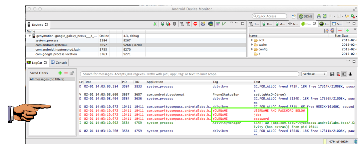 In Android Device Monitor, find the red log entries with your name on them, as shown below.