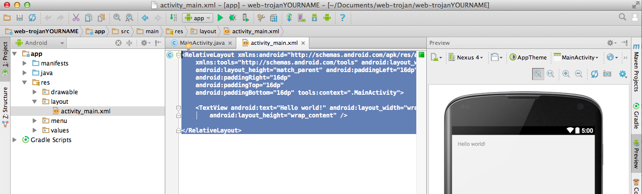 In the center pane, XML text appears, starting with "<RelativeLayout".