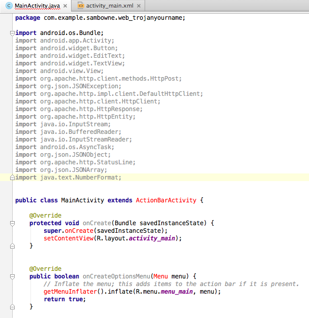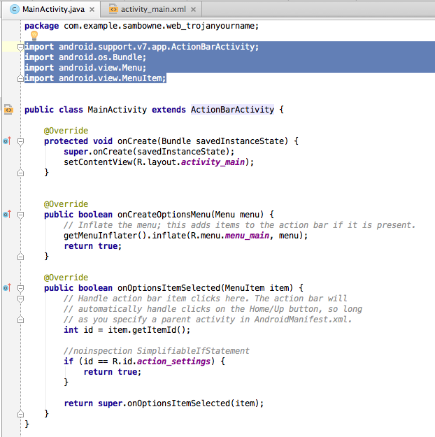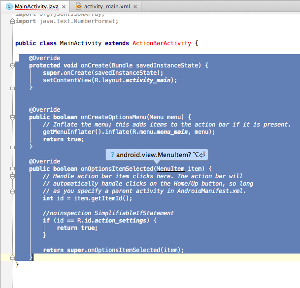 Highlight all the code inside the "public class MainActivity extends ActionBarActivity {" object, as shown below: