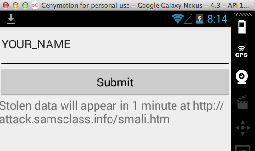 resp.setText("Stolen data will appear in 1 minute at http://attack.samsclass.info/smali.htm");