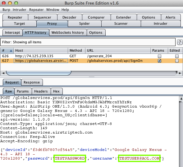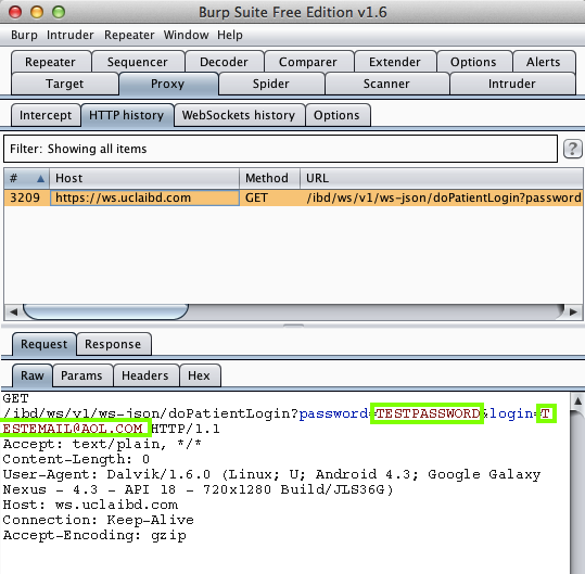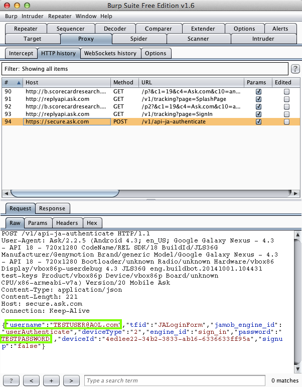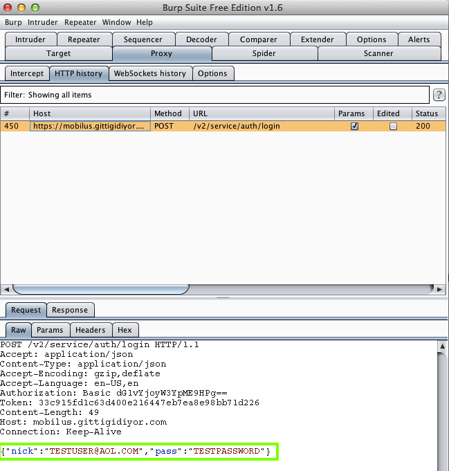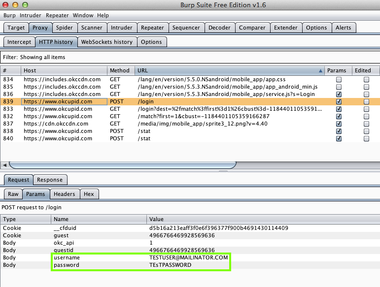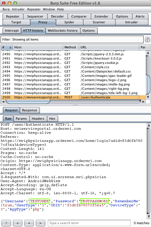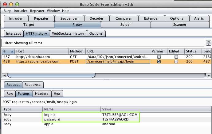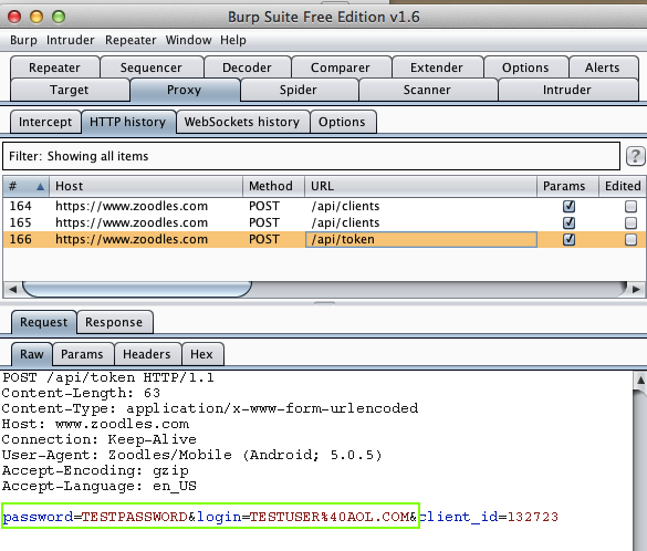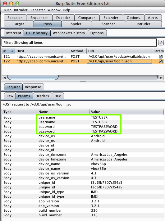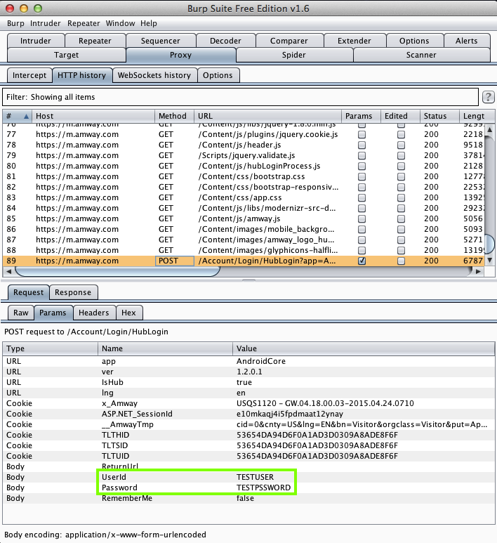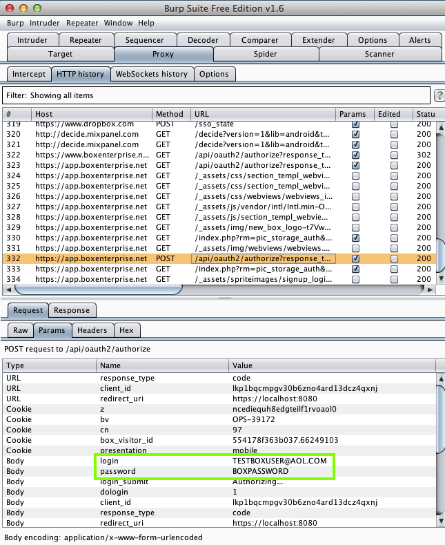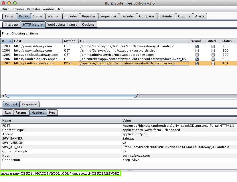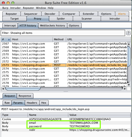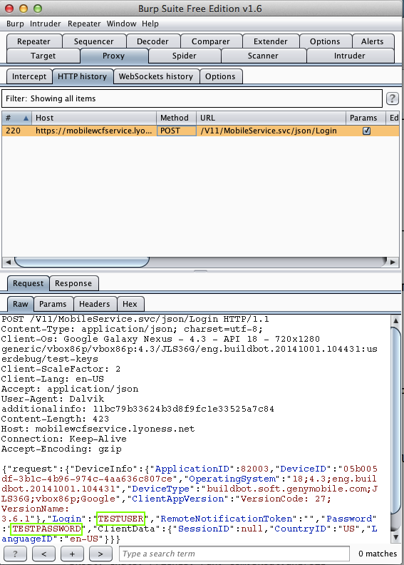I logged in with test credentials, and harvested them from Burp via MITM attack. Note that the HTTPS certificate is not validated, so the username is visible, but since the app uses hashing the password is not visible.