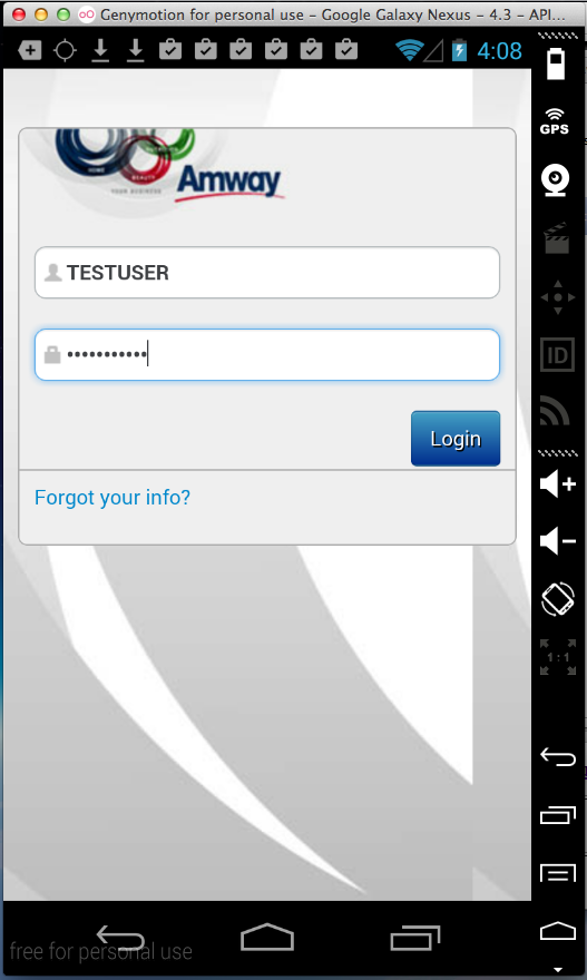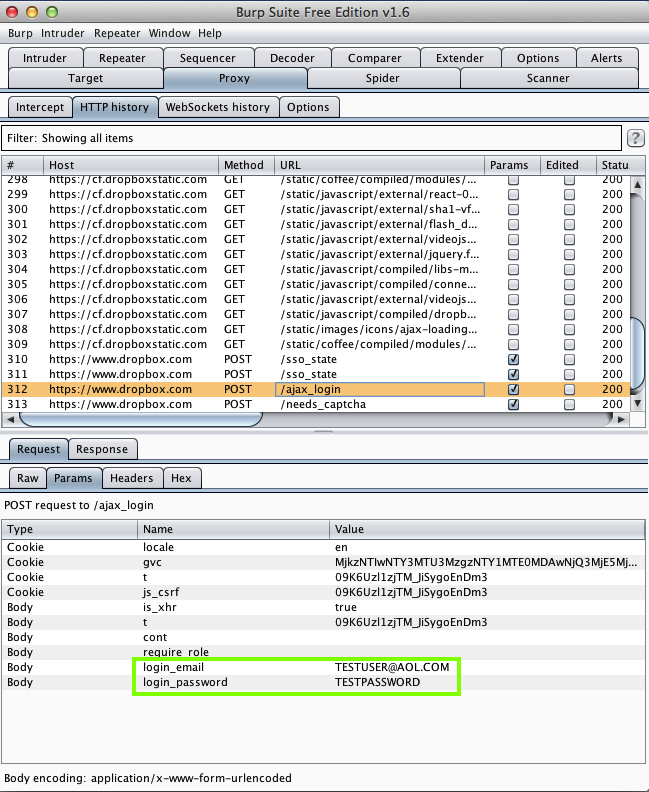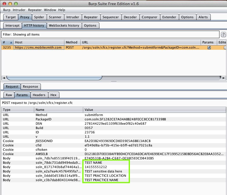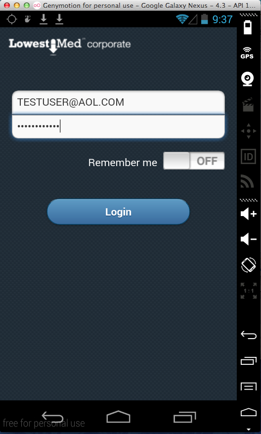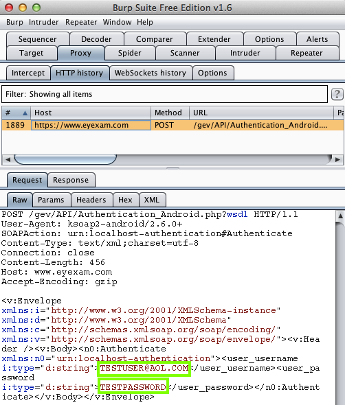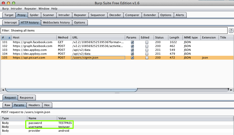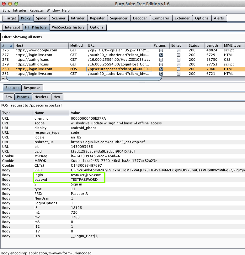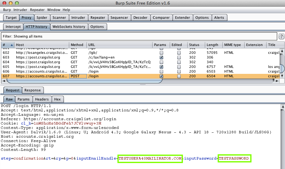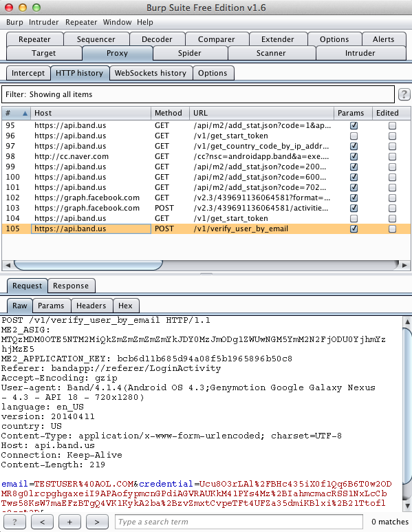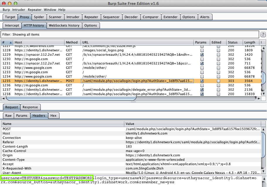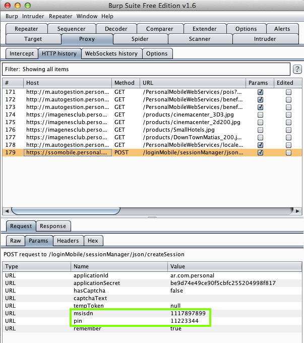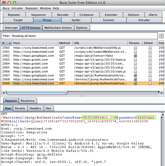 I logged in with test credentials, and harvested them from Burp via MITM attack. Note that the HTTPS certificate is not validated, so the username is visible, but since the app uses hashing the password is not visible.