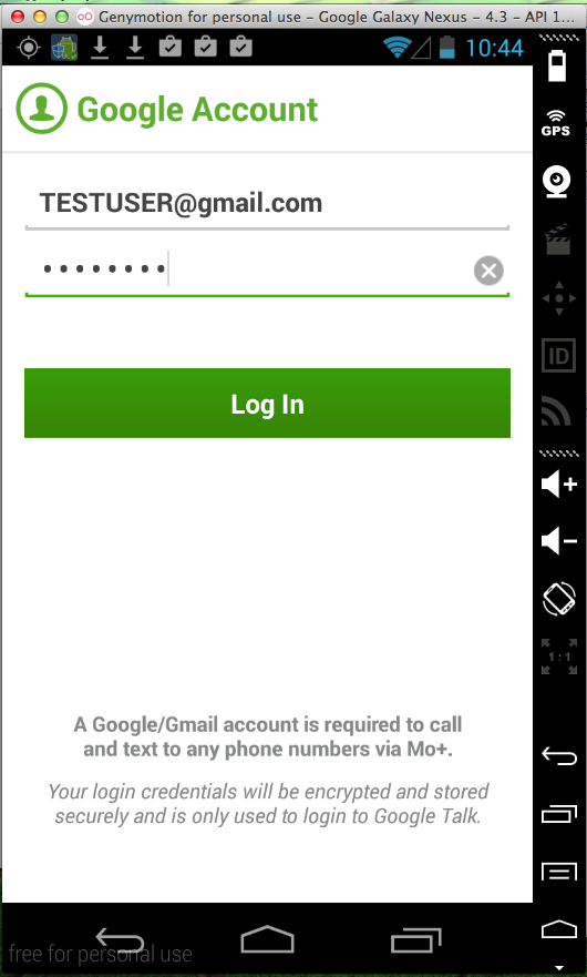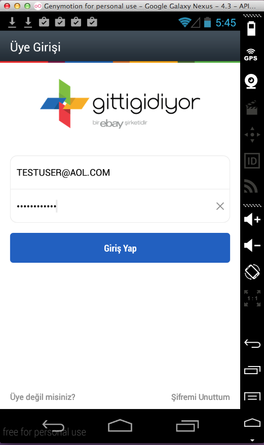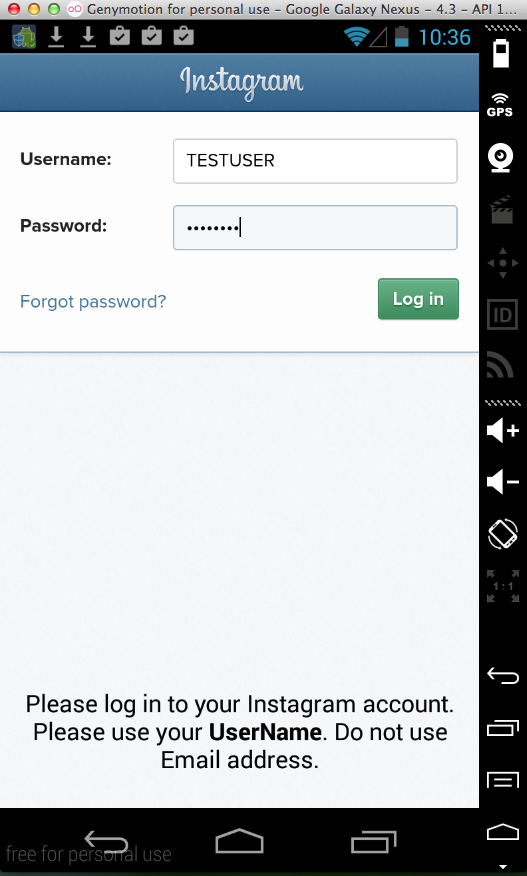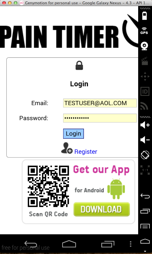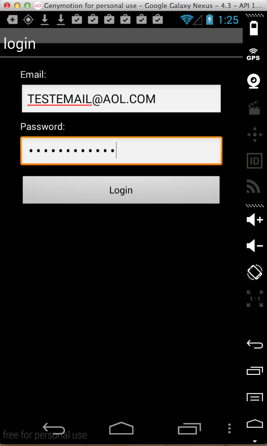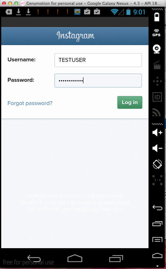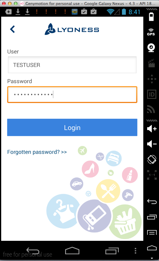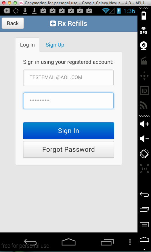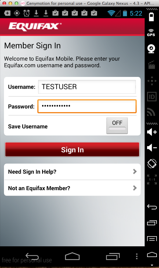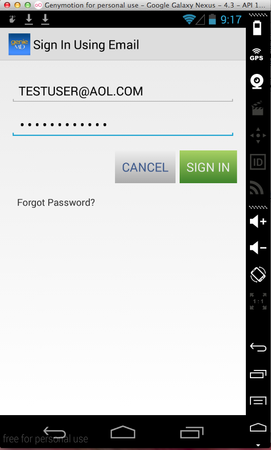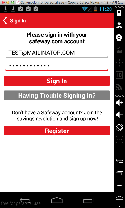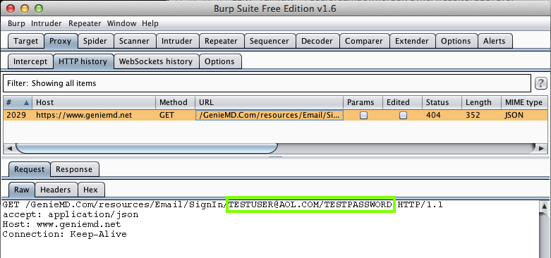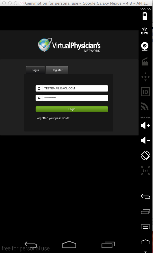 I logged in with test credentials, and harvested them from Burp via MITM attack. Note that the HTTPS certificate is not validated, so the username is visible, but since the app uses hashing the password is not visible.