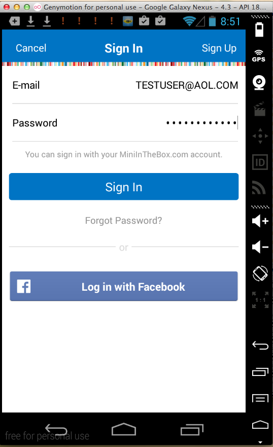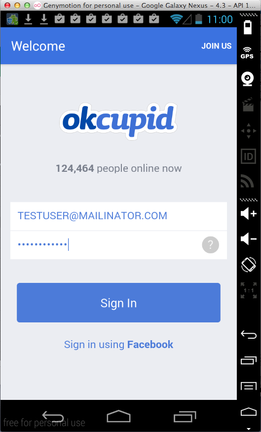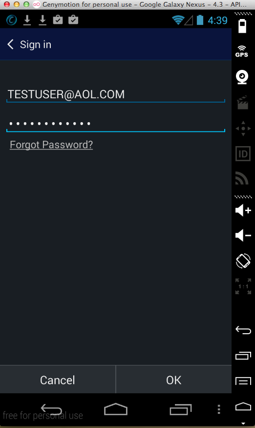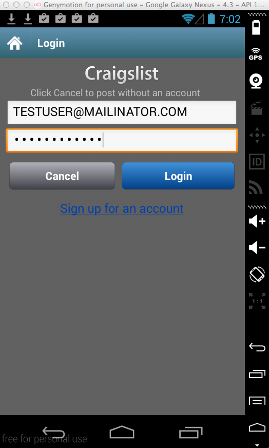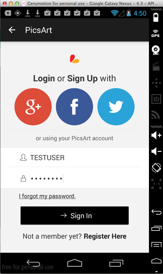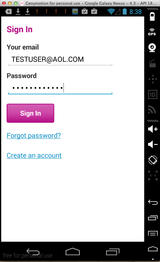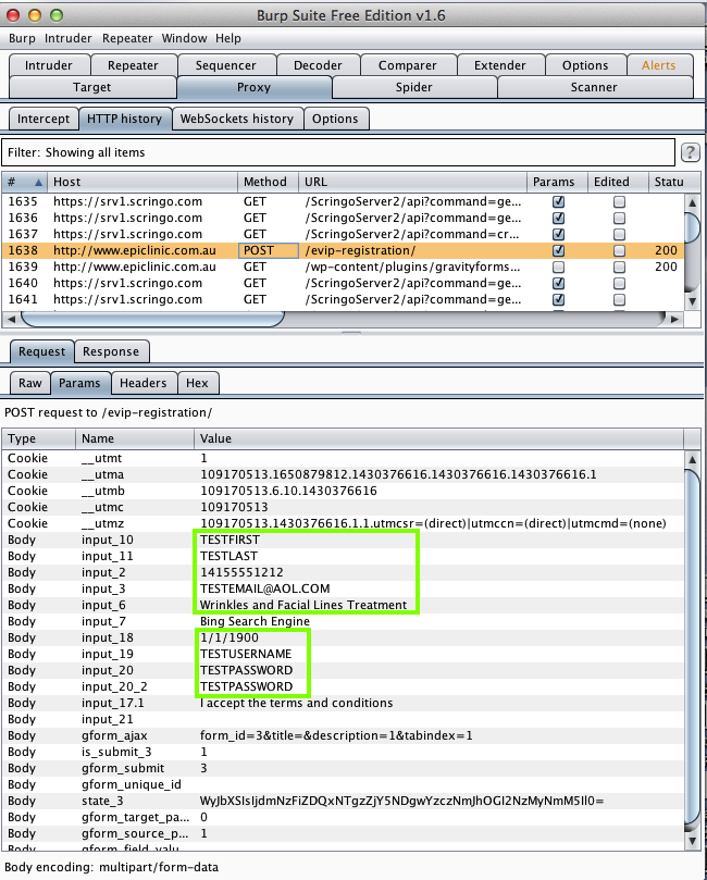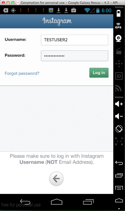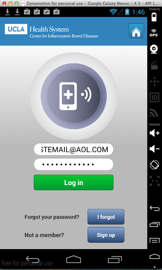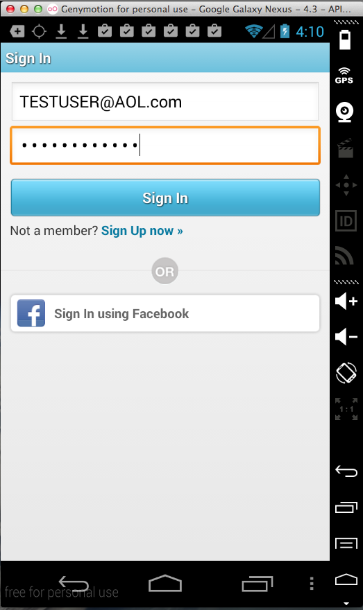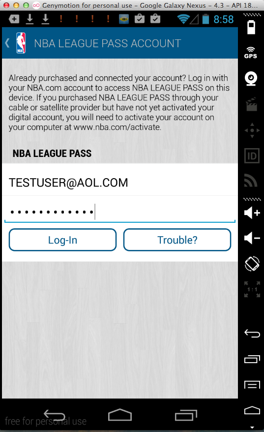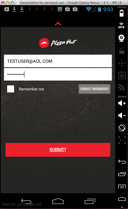 I logged in with test credentials, and harvested them from Burp via MITM attack. Note that the HTTPS certificate is not validated, so the username is visible, but since the app uses hashing the password is not visible.