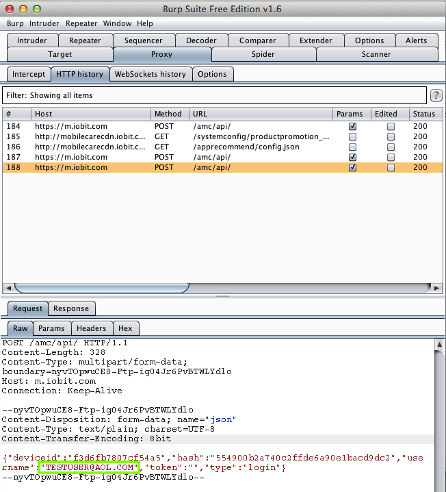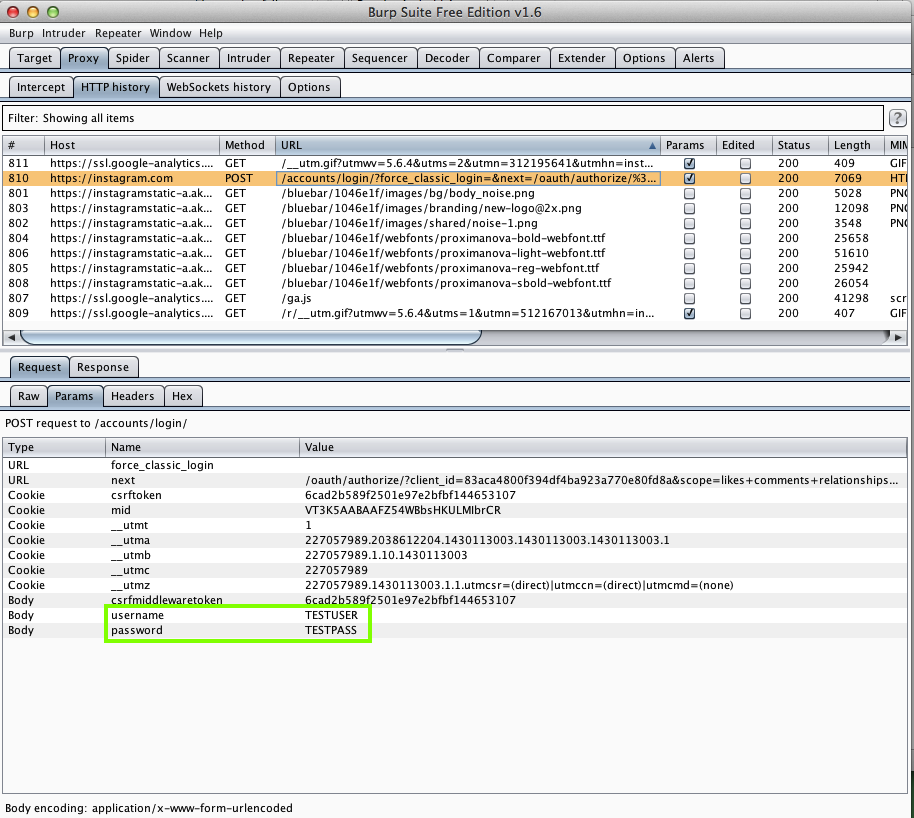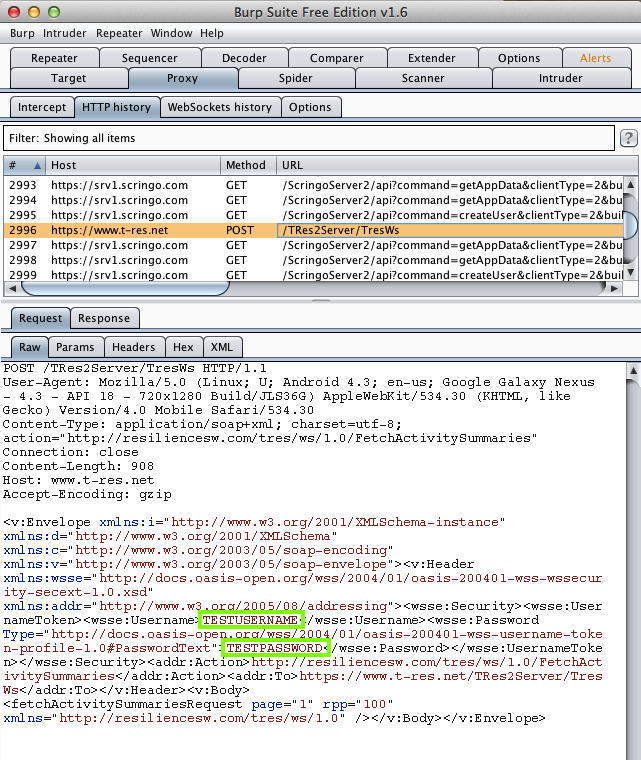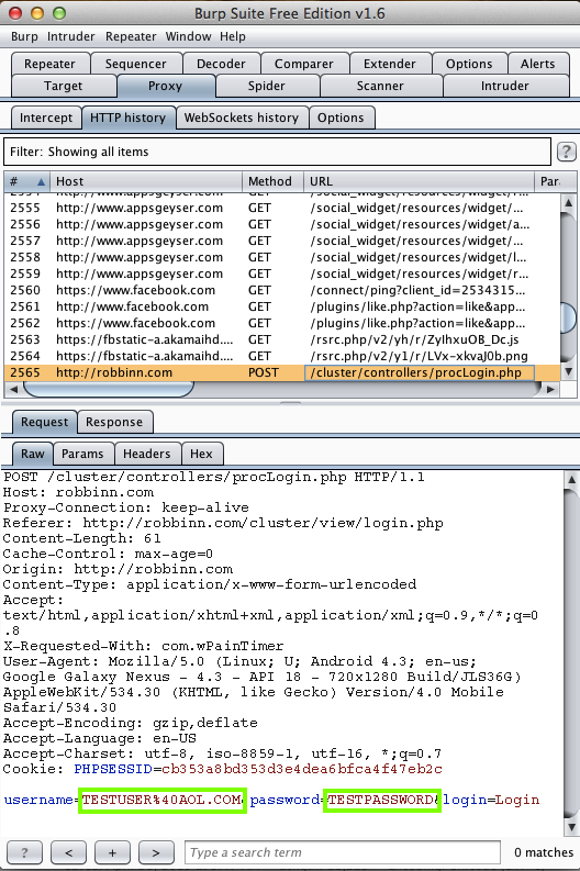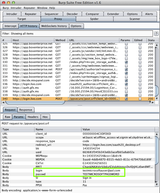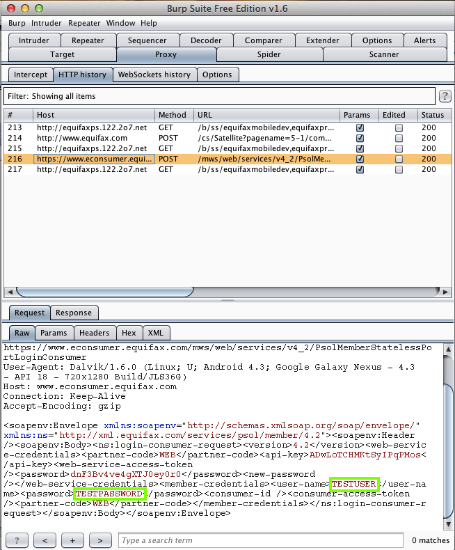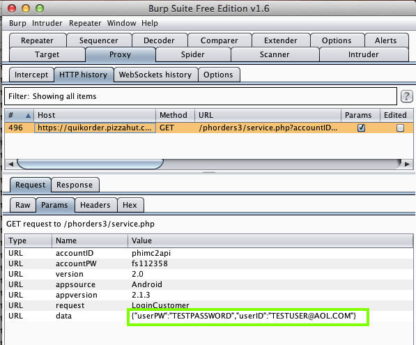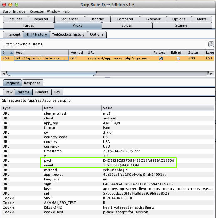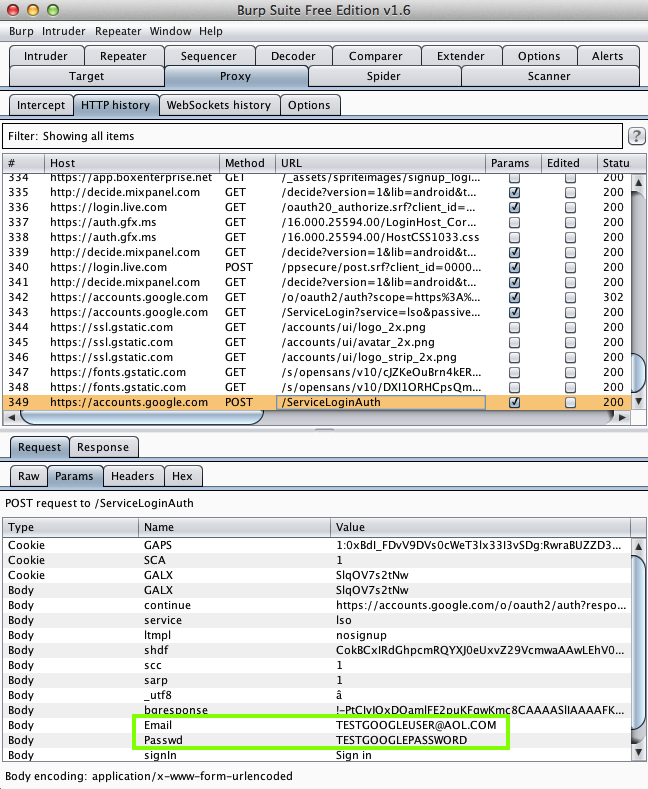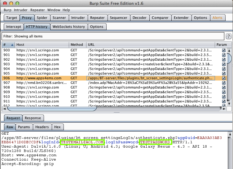 Harvesting them from Burp is to easy--this app uses HTTP with no encryption at all!