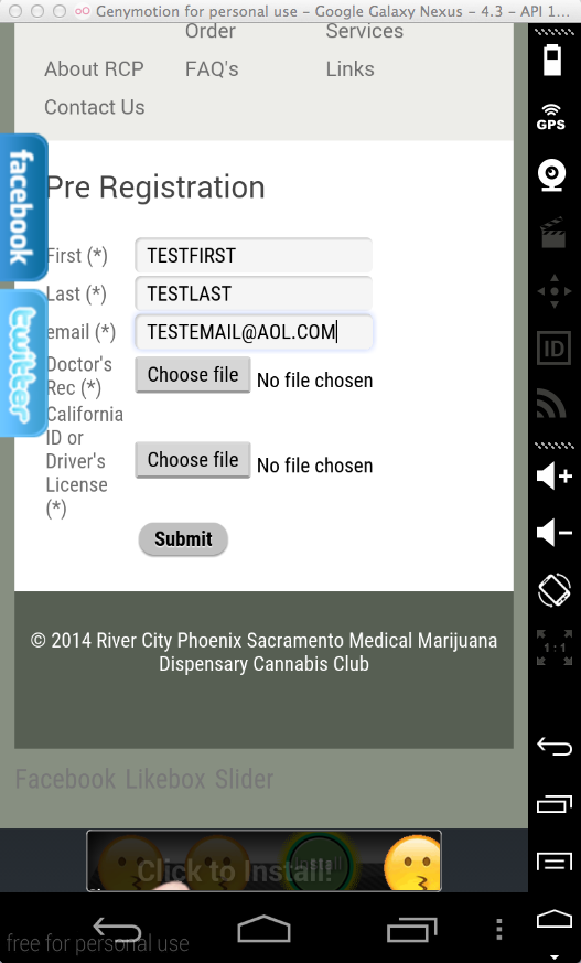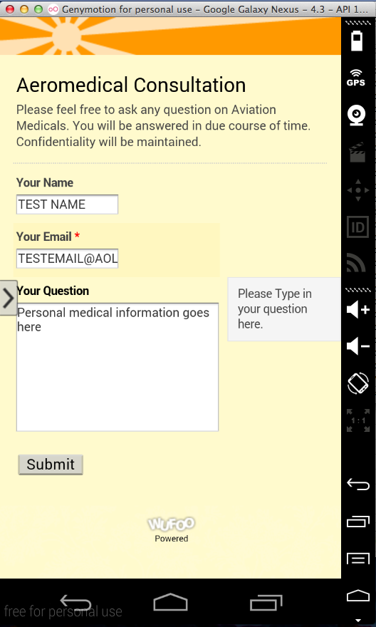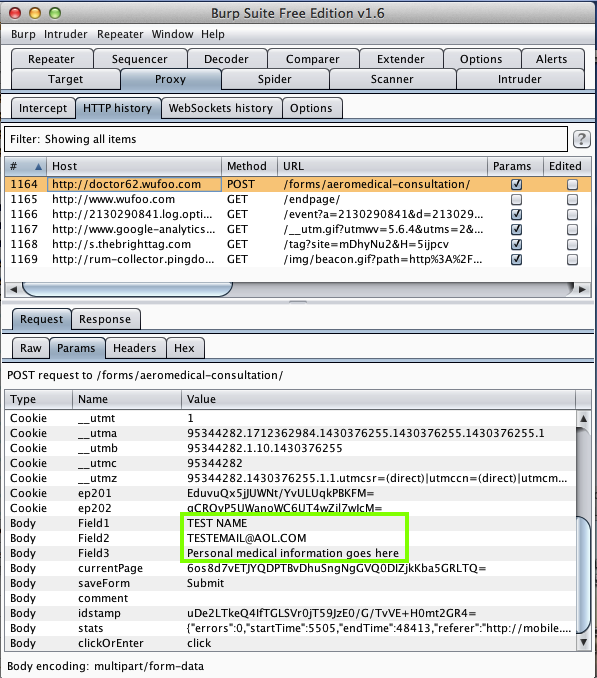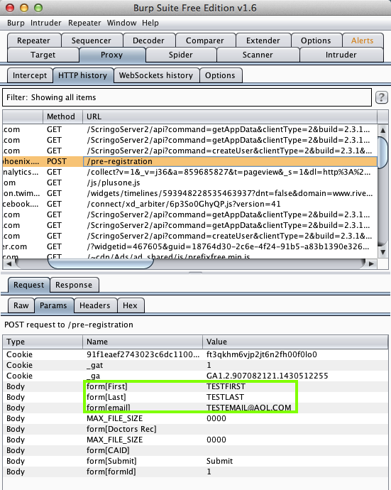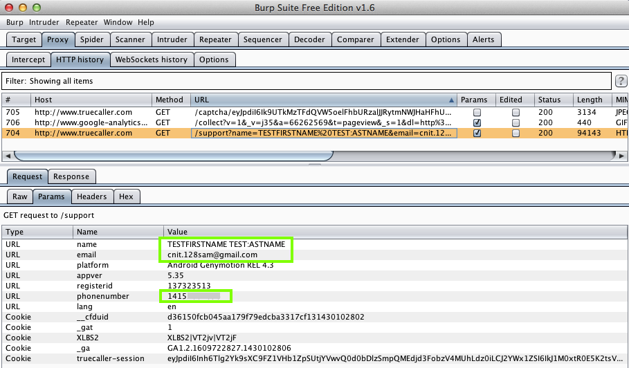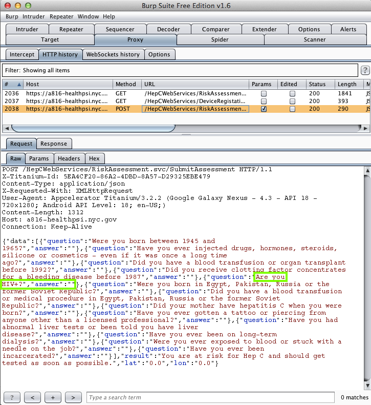 The app doesn't use SSL at all. Instead, it sends the user's private data (email, name, and phone number, which is redacted in the image below) in plaintext each time the user clicks "FAQ":