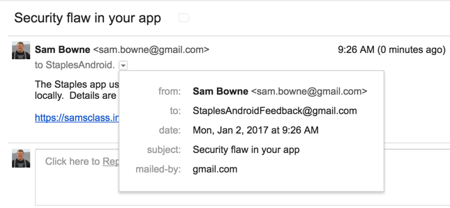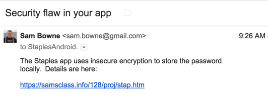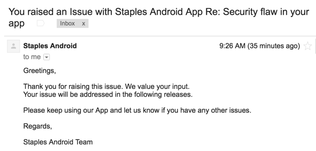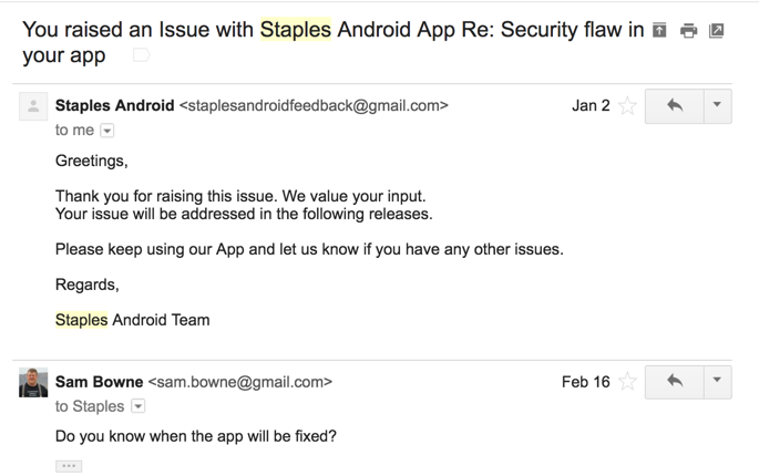 I never got any reply. I don't think anyone at Staples actually read any of my messages, and I don't believe any fix is coming. So I decided to disclose this publicly and use it for homework.