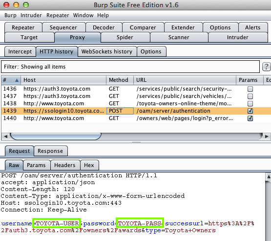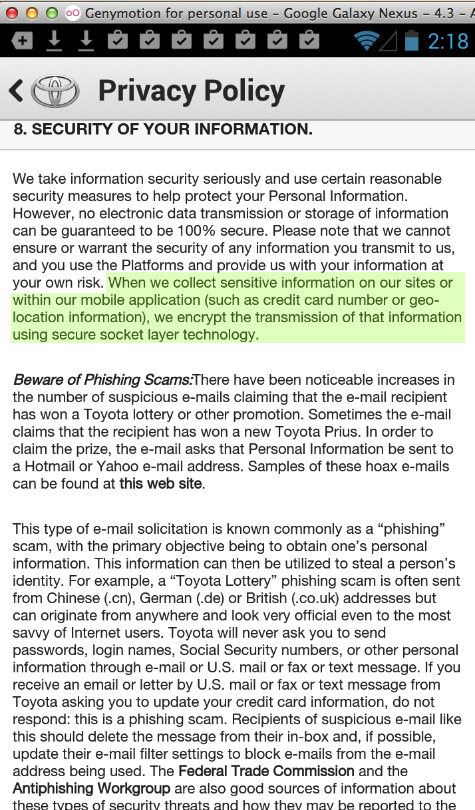 Here's the Toyota Privacy Policy, which claims to use "secure socket layer."