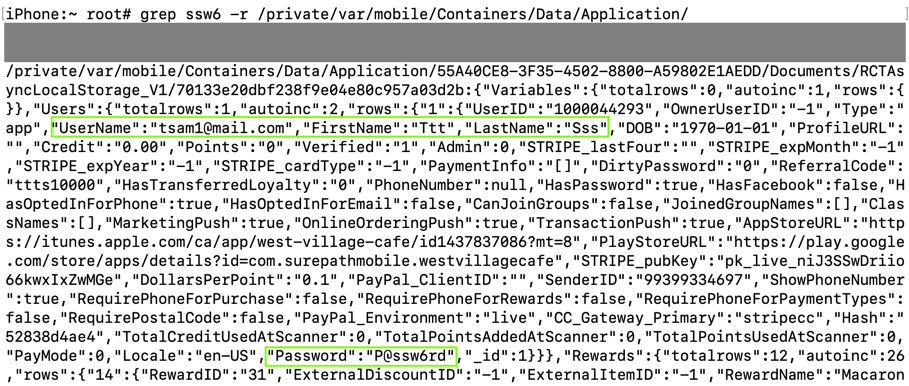 I attempted a login with the password P@ssw5rd, and then created an account with the password P@ssw6rd. As shown below, the passwords were stored on the iPhone without encryption.