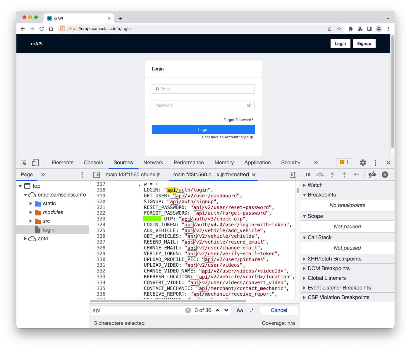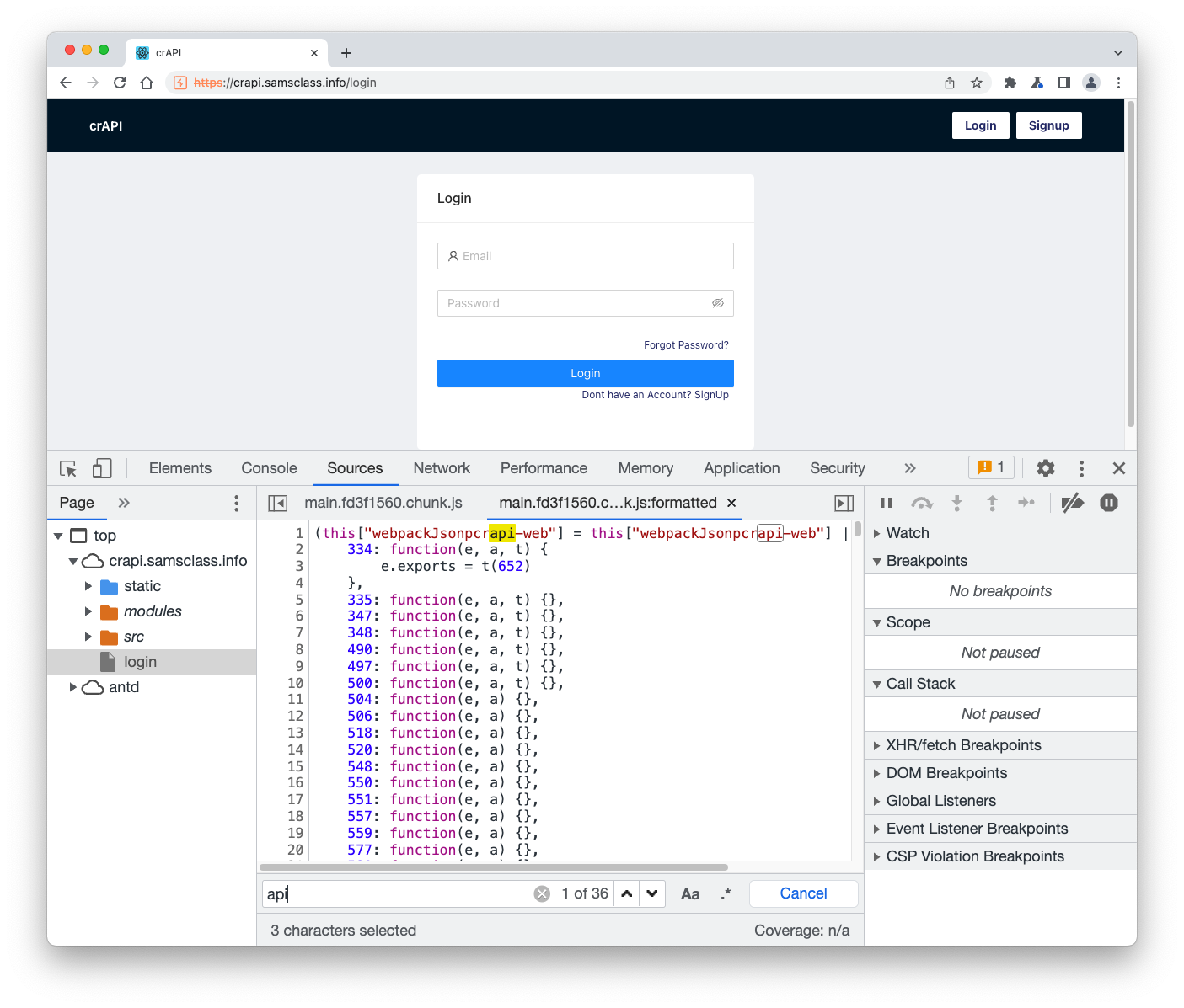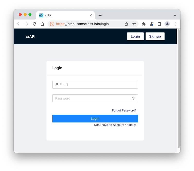 https://crAPI.samsclass.info The crAPI login page opens, as shown below.