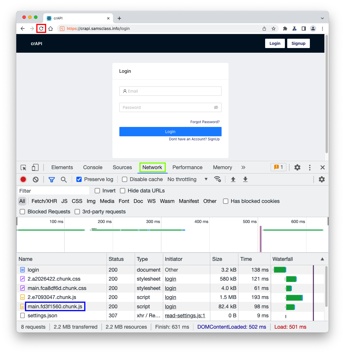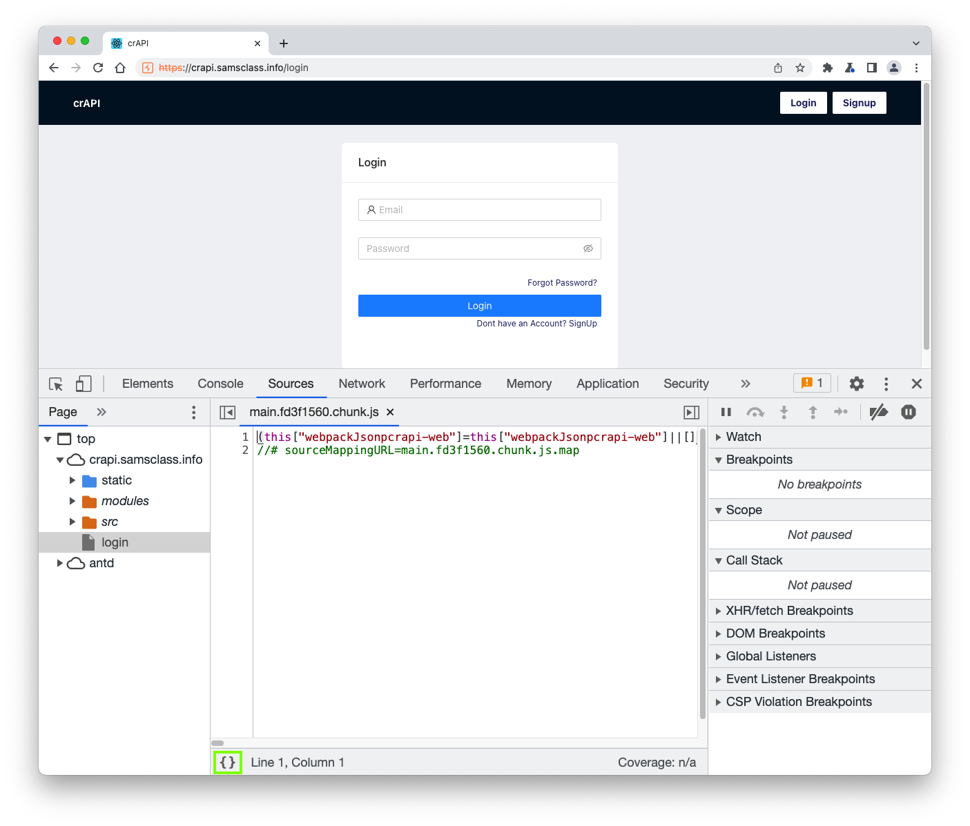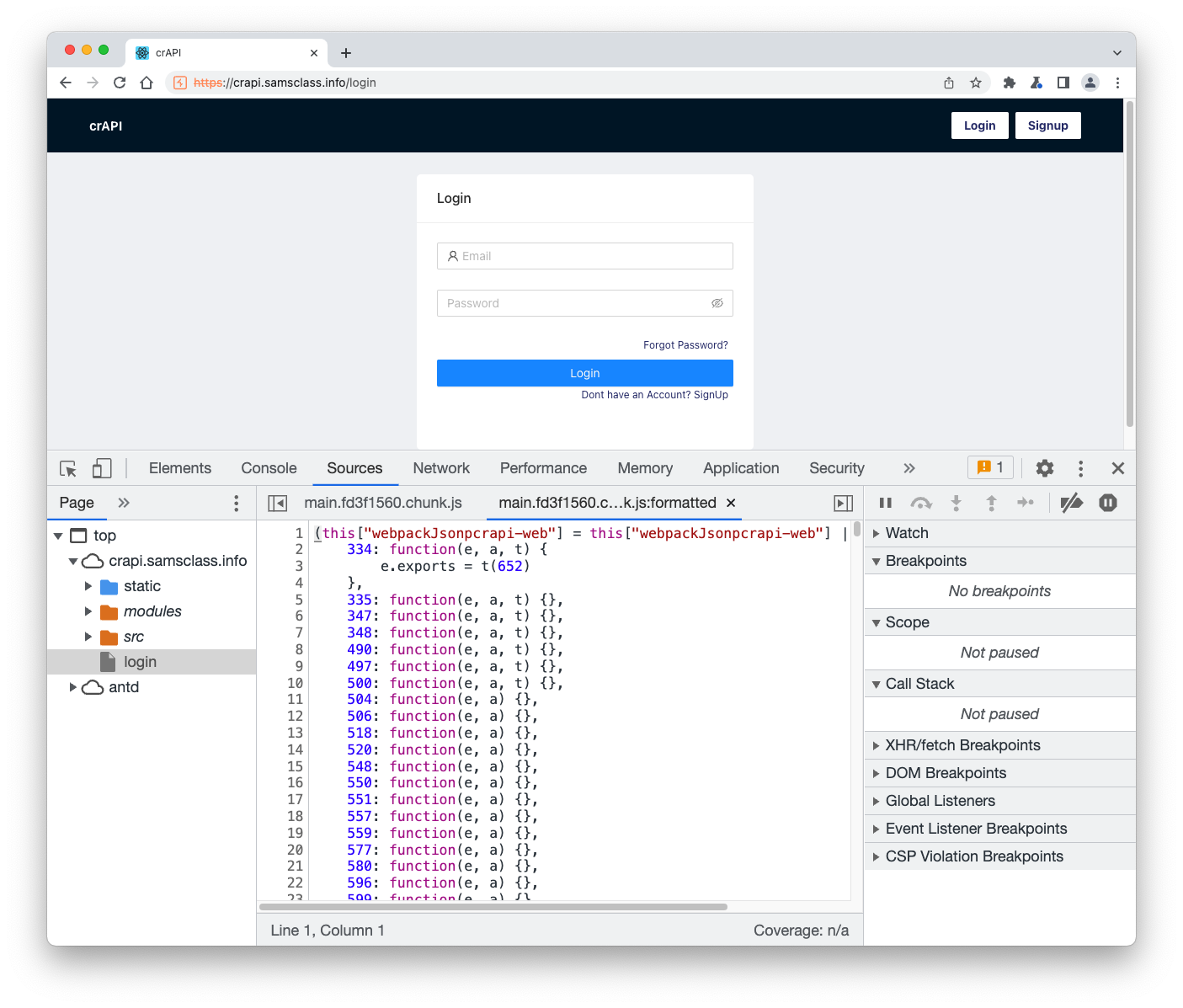 https://crAPI.samsclass.info The crAPI login page opens, as shown below.