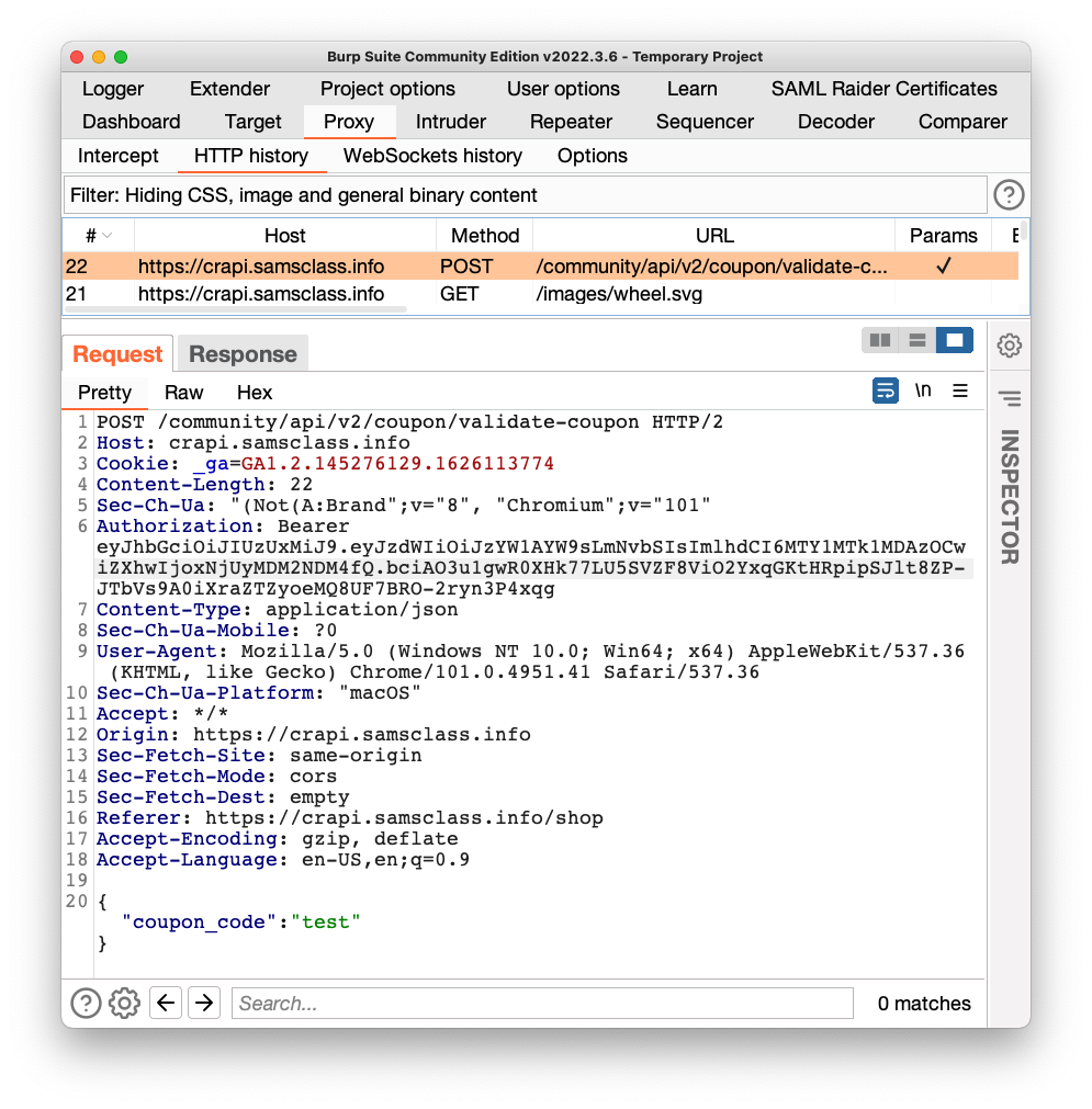 The request contains only one JSON parameter, at the bottom of the image shown below.Right-click this request and click "Send to Intruder".