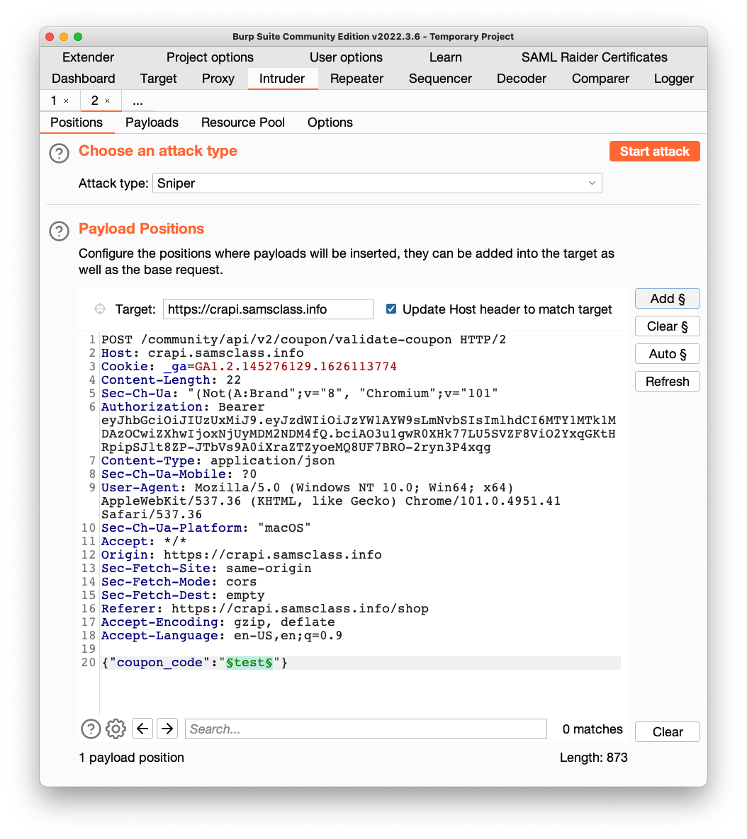 On the Intruder tab, on the Positions sub-tab, at the bottom, remove the quotes around the injection, as shown below.