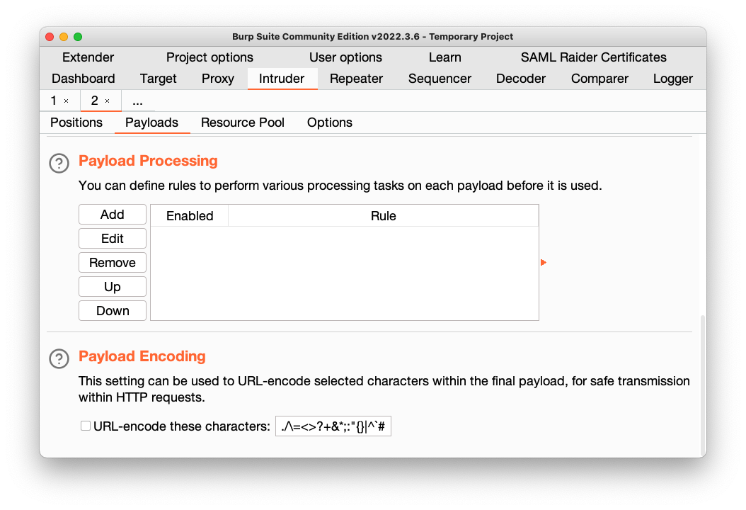On the Intruder tab, on the Payloads sub-tab, scroll to the bottom and clear the "URL-encode these characters..." box, as shown below.