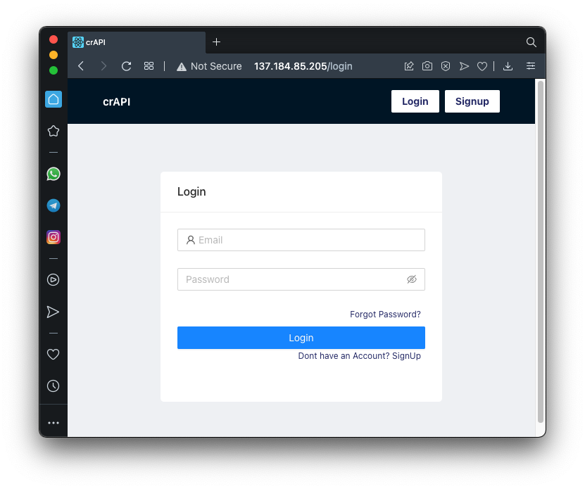 To test it, open your server's IP address in a Web browser. You should see the crAPI login page, as shown below.