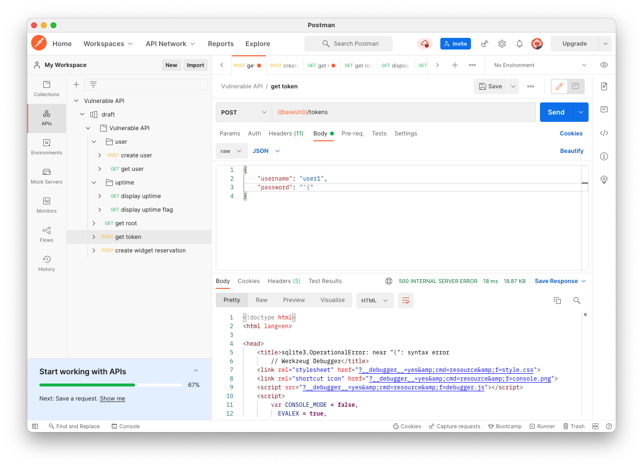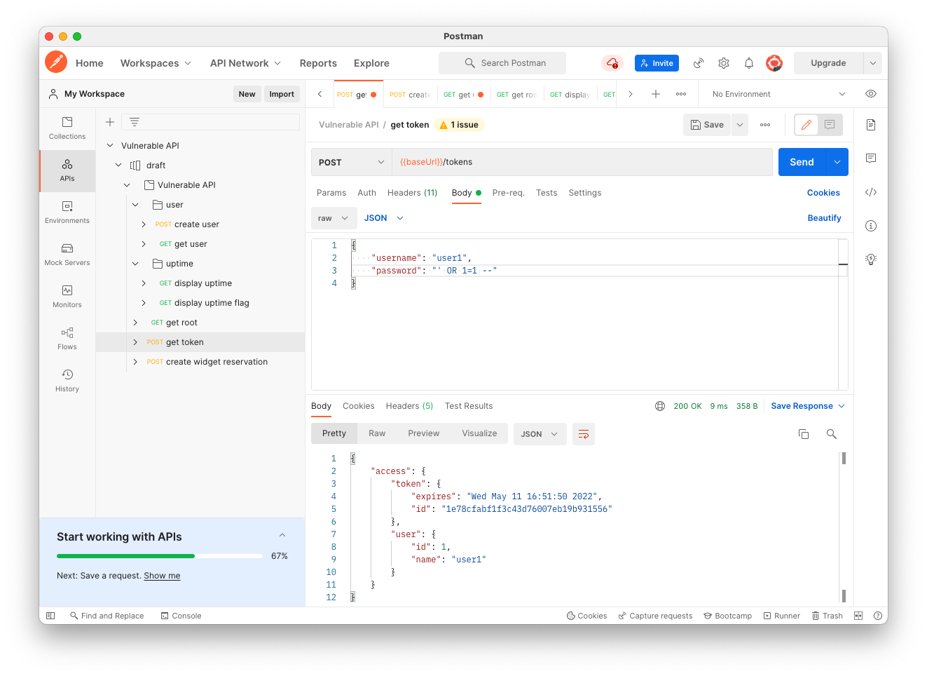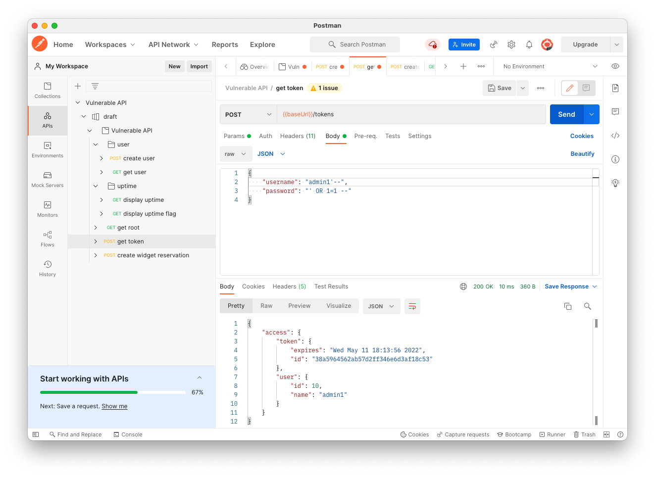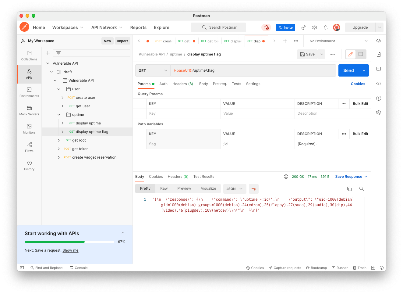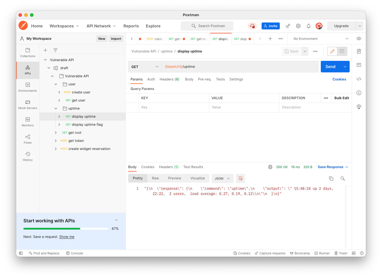 In Postman, in the "Vulnerable API" collection, navigate to the "display uptime" request, as shown below.