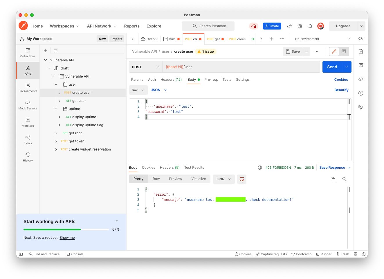 Using the administrator token, use the "create user" endpoint to create a user named "test".The flag is covered by a green rectangle in the image below.
