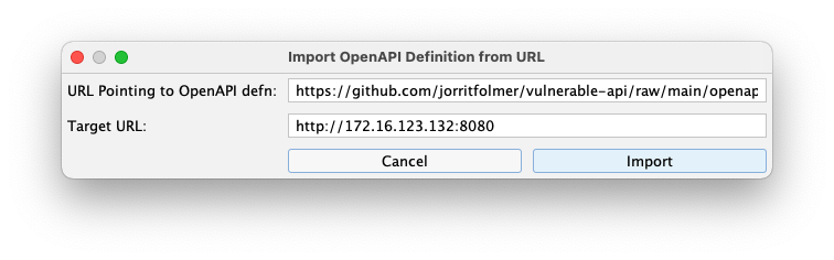 In Zap, from the menu, click Import, "Import an Open API definition from a URL" Enter this URL into the top field, and your API URL in the lower field, as shown below.
