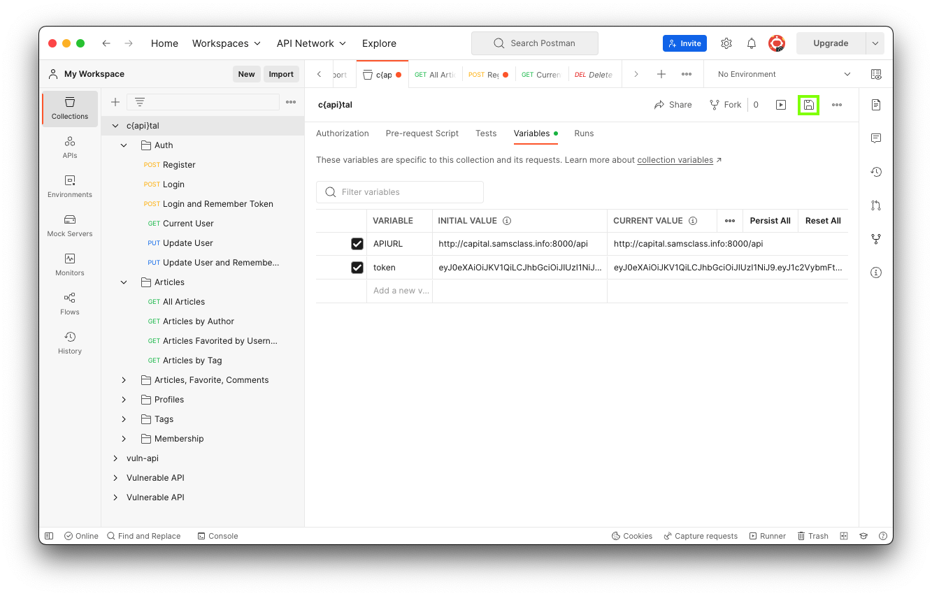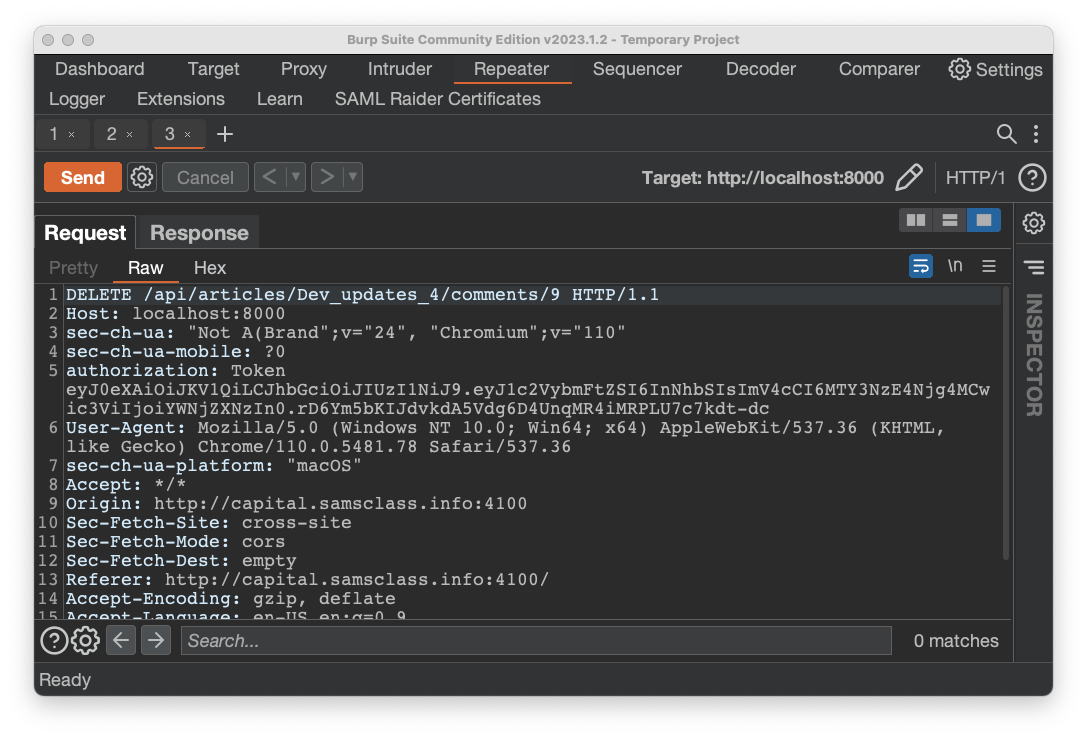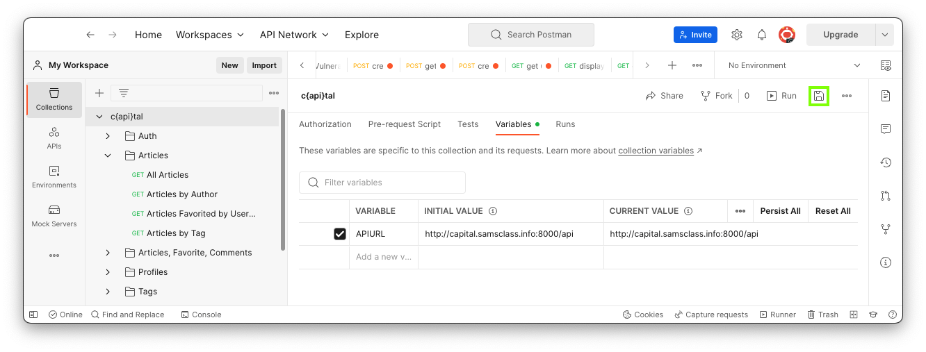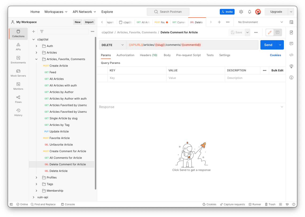 In Postman, in the c{api}tal container, expand the "Articles, Favorites, Comments" container and click "Delete Comments for Article".