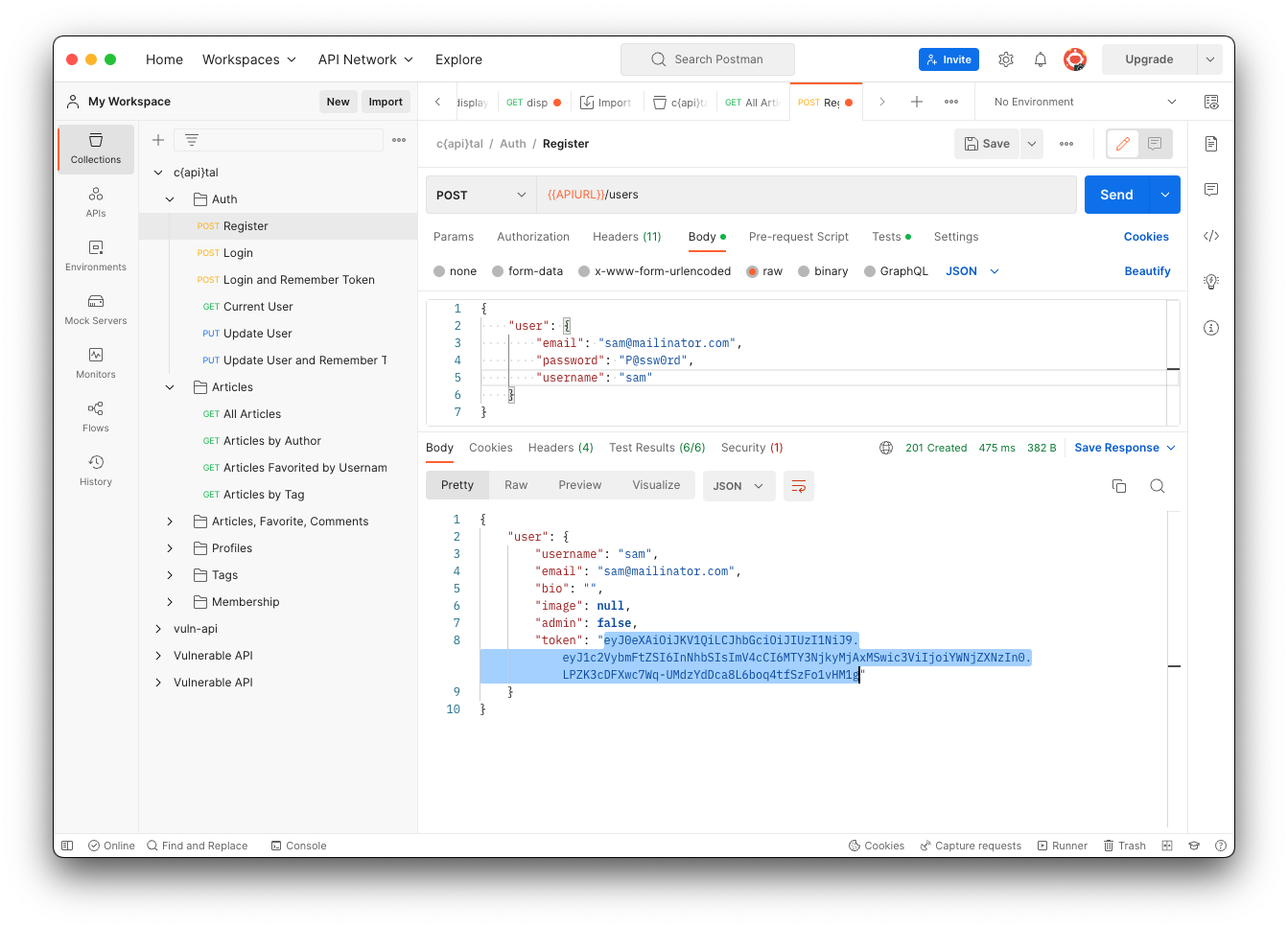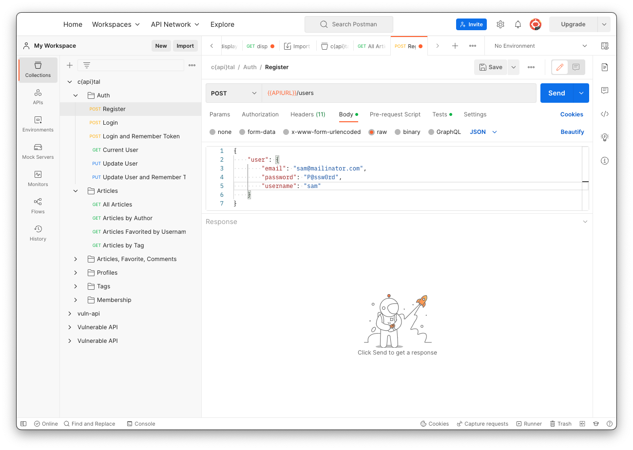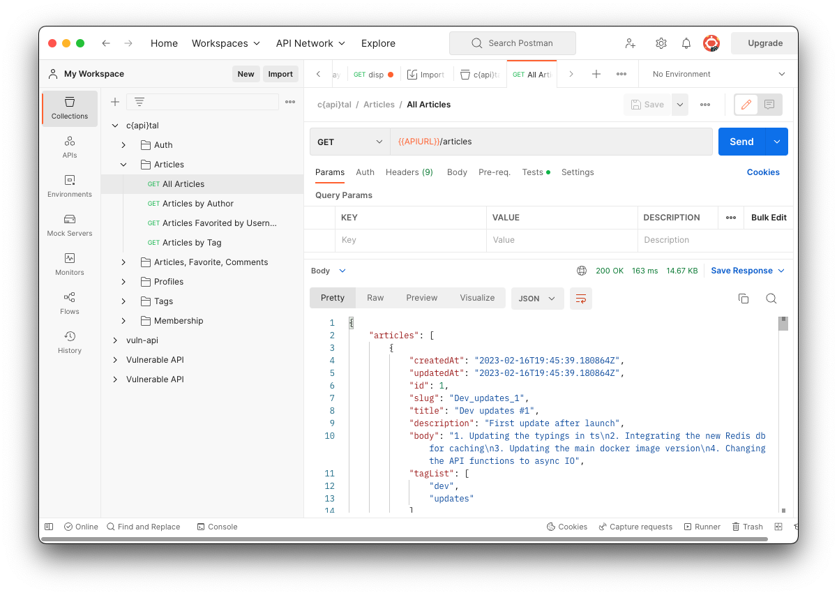 In Postman, in the c{api}tal container, expand the "Articles, Favorites, Comments" container and click "Delete Comments for Article".