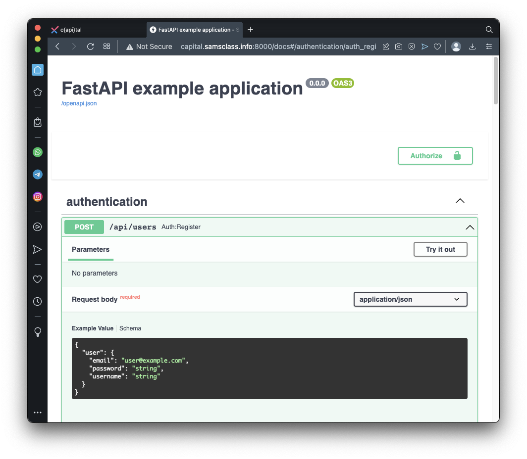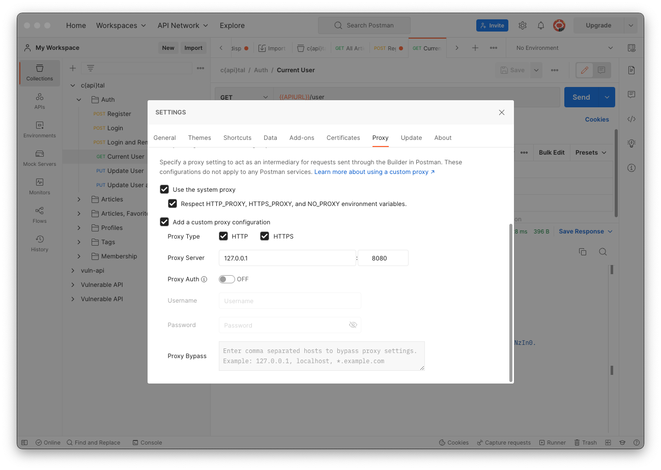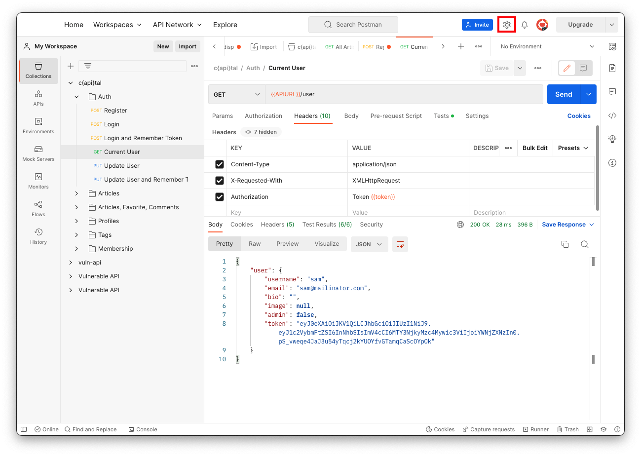 In the list of Collections, in the c{api}tal container, in the Auth container, click "Current User".