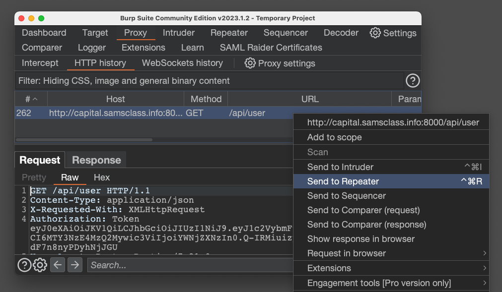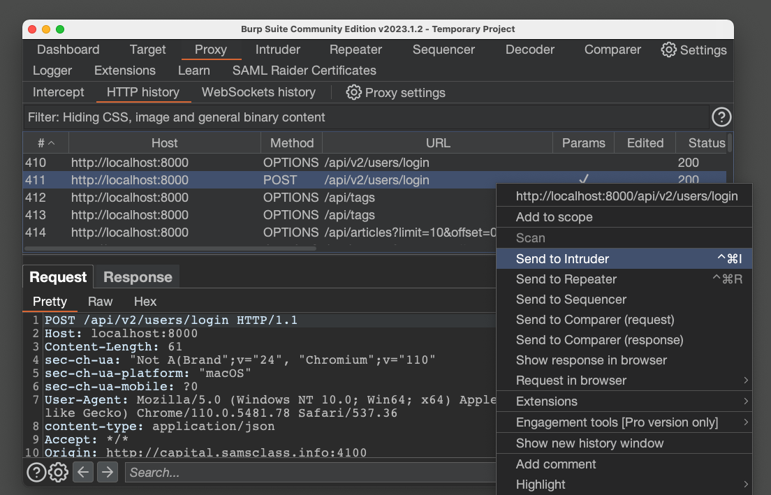 In Burp, on the Proxy tab, on the "HTTP history" sub-tab, find the login request.