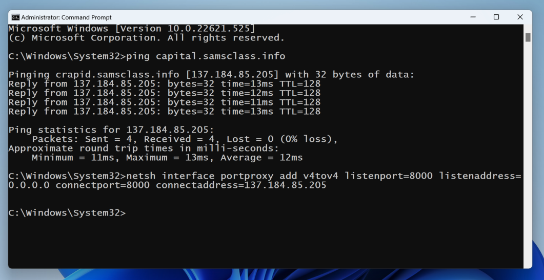 ping capital.samsclass.info netsh interface portproxy add v4tov4 listenport=8000 listenaddress=0.0.0.0 connectport=8000 connectaddress=137.184.85.205