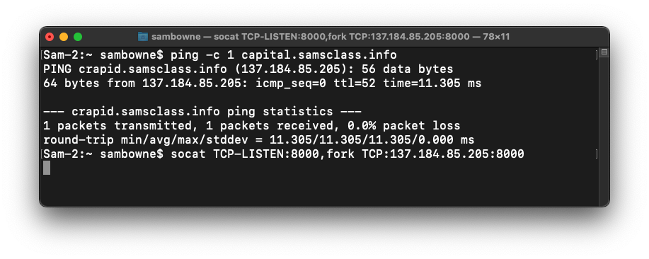 ping -c 1 capital.samsclass.info socat TCP-LISTEN:8000,fork TCP:137.184.85.205:8000