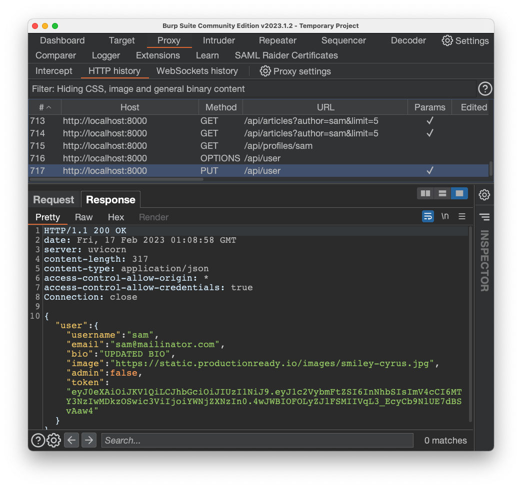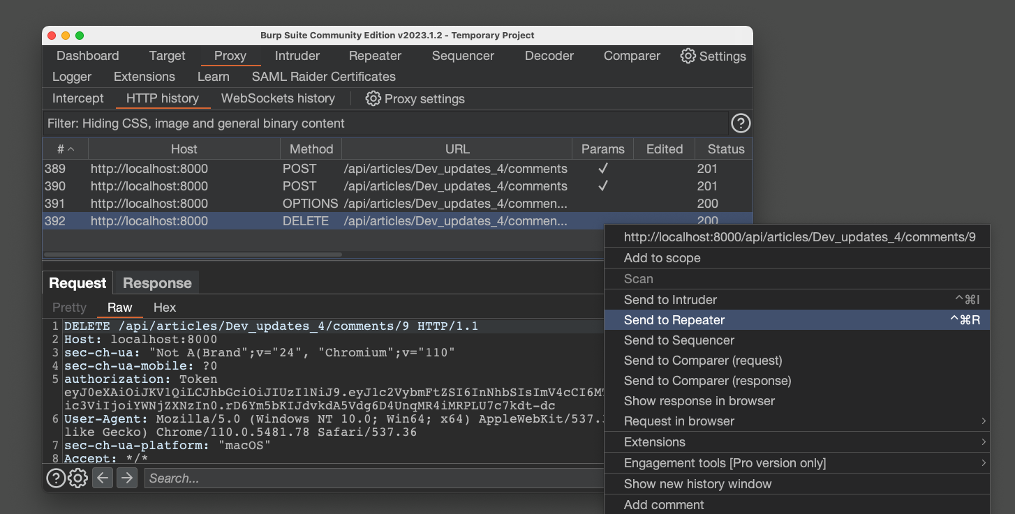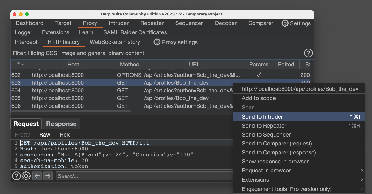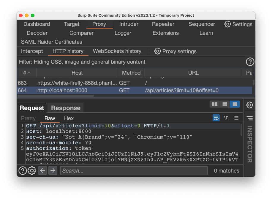 In Burp, on the Proxy tab, on the "HTTP history" sub-tab, find the GET request that loaded the articles, as shown below.