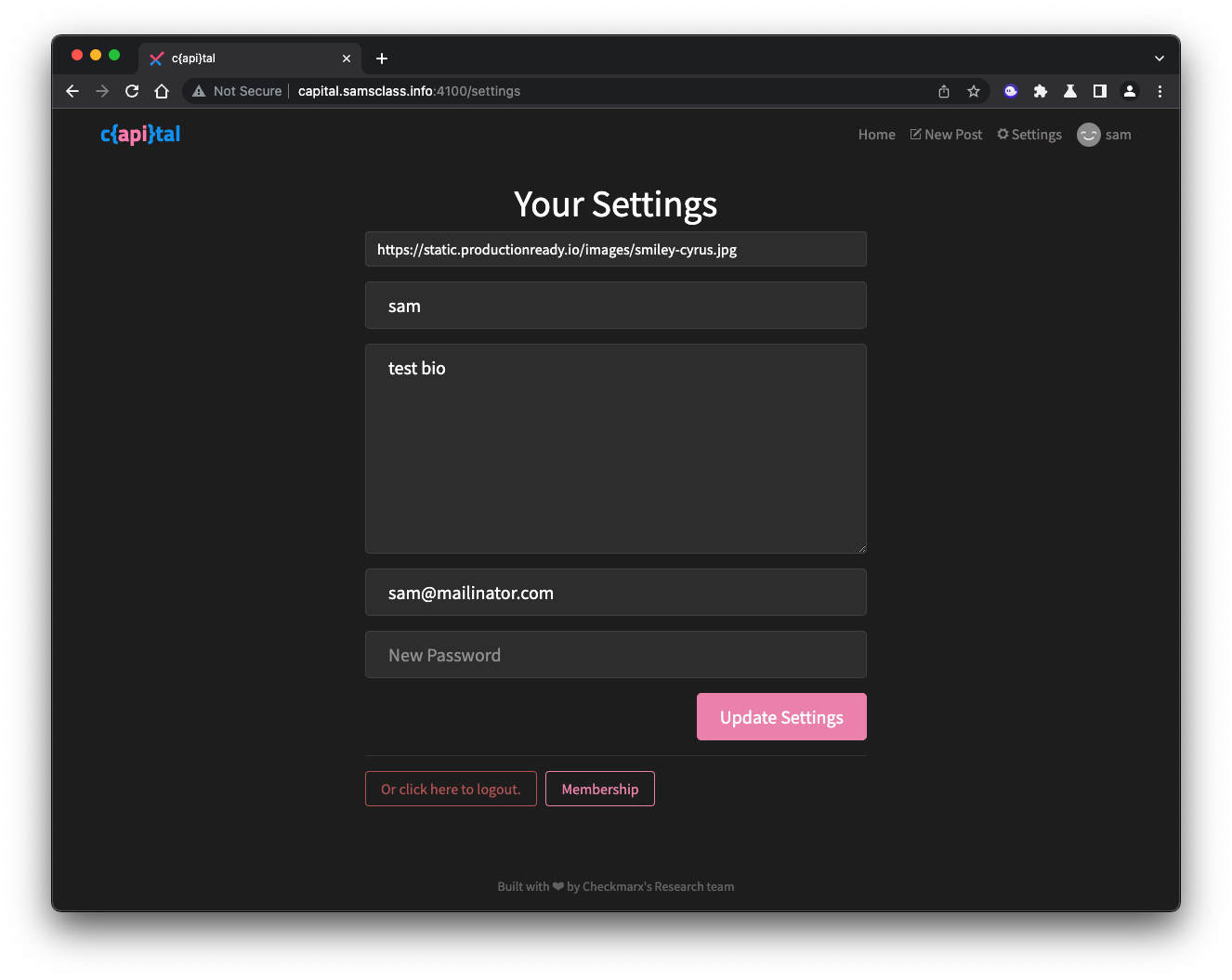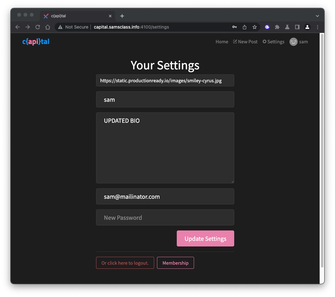 Enter updated bio data, as shown below, and click the "Update Settings" button.