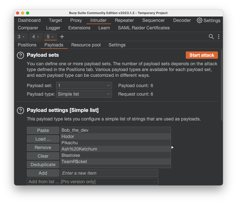 Paste the words into the "Payload settings [Simple list]" box, as shown below.