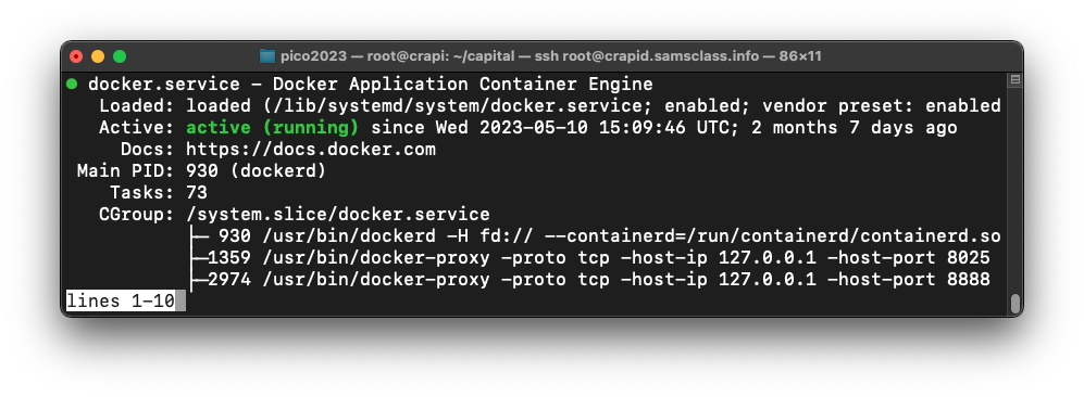 sudo apt update sudo apt -y install apt-transport-https ca-certificates curl gnupg2 software-properties-common curl -fsSL https://download.docker.com/linux/debian/gpg | gpg --dearmor -o docker-archive-keyring.gpg sudo mv docker-archive-keyring.gpg /usr/share/keyrings/ cd git clone https://github.com/jorritfolmer/vulnerable-api.git sudo apt -y install virtualenv echo "deb [arch=amd64 signed-by=/usr/share/keyrings/docker-archive-keyring.gpg] https://download.docker.com/linux/debian $(lsb_release -cs) stable" | \ sudo tee /etc/apt/sources.list.d/docker.list sudo apt update sudo apt -y install docker-ce docker-ce-cli containerd.io sudo systemctl status dockerPress q to exit the status view.