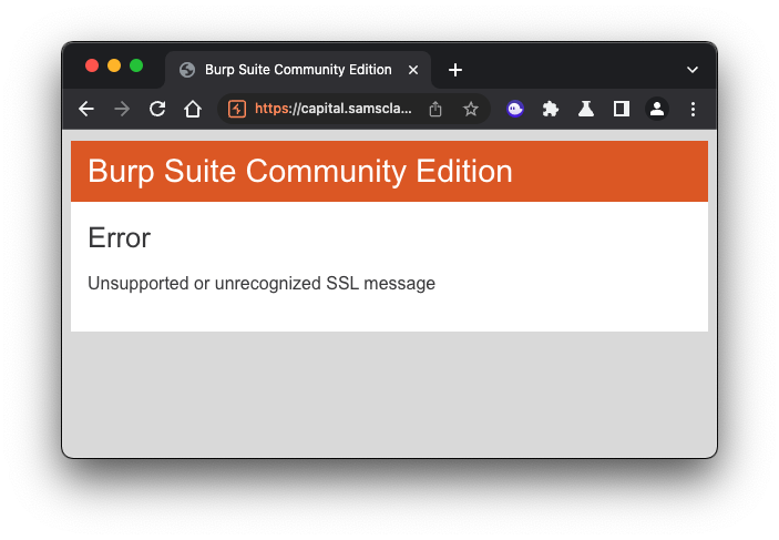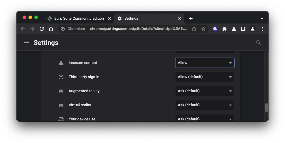 Burp's built-in Chromium browser may block the c{api}tal page as shown below.To fix this, click the little symbol in the URL bar to the left of "https".