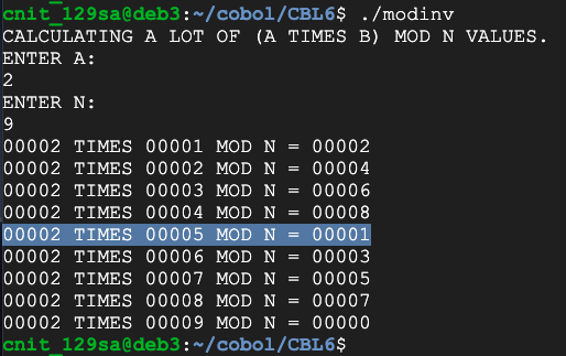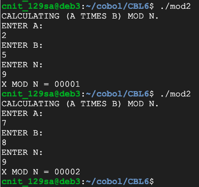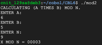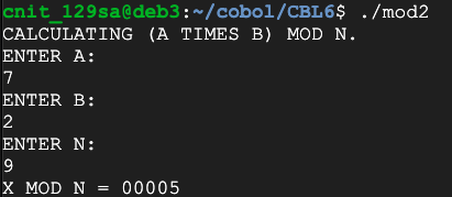 DISPLAY WS-A " TIMES " WS-B ' MOD N = ' WS-X-MOD-N