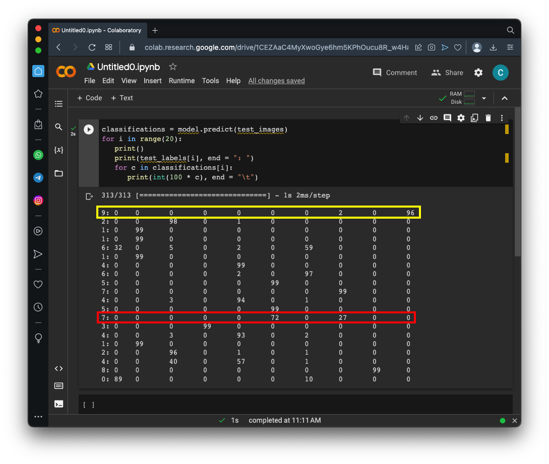 On each line of the output, the first number is the correct category, and the next ten numbers are the percentages the model puts out for category 0, 1, 2, ... through category 9.