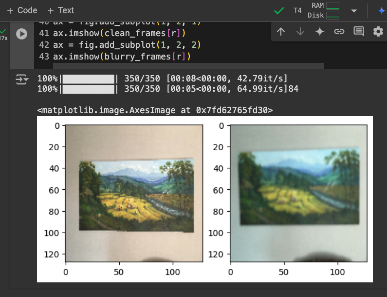 Repeat the process using "blur2.zip" from my server. Be careful to change the folder name to "blur2" when fetching the good_frames and bad_frames.Train the model for 100 epochs.